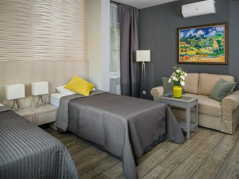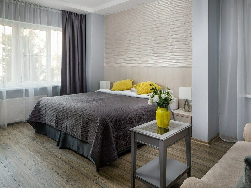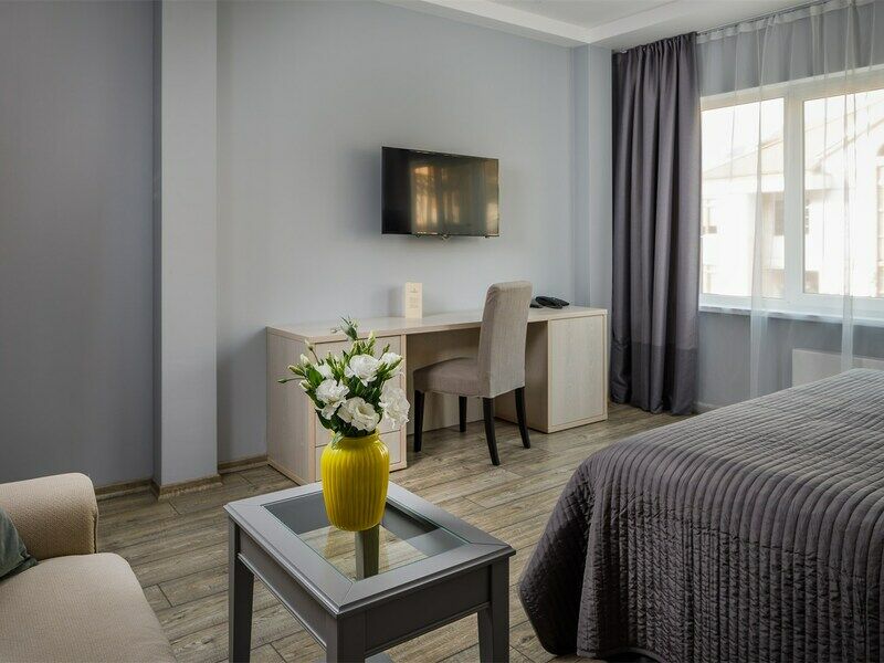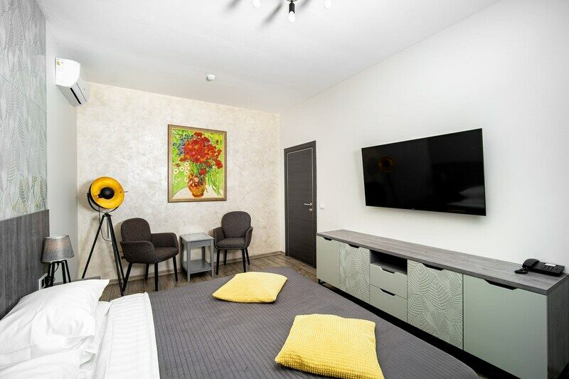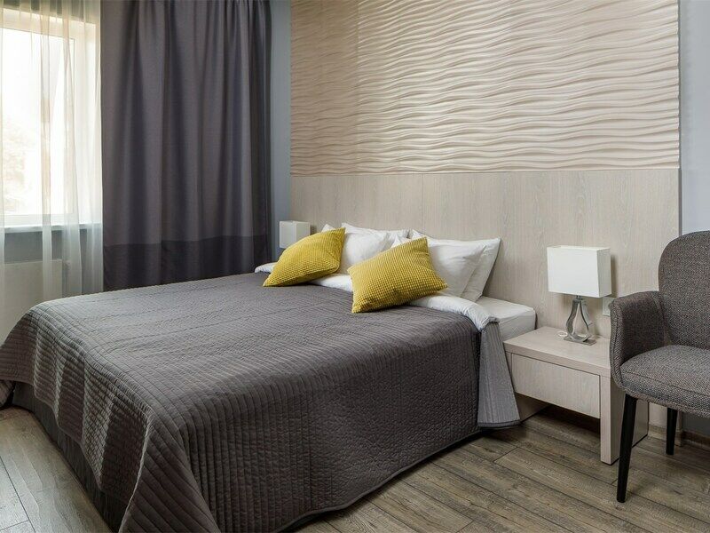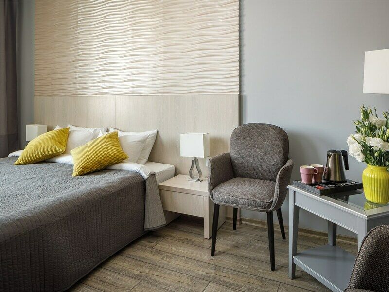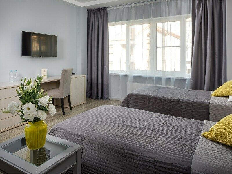 Современный пятиэтажный корпус отеля (без лифта) занимает небольшую благоустроенную территорию площадью 6000 кв.м. Небольшой жилой фонд предлагает гостям двухместные номера Стандарт и Люкс. Везде стильный лаконичный интерьер, выдержанный в спокойной гамме бело-серых оттенков с добавлением акцентного желтого. Все комнаты оснащены душем, кондиционером и техникой.