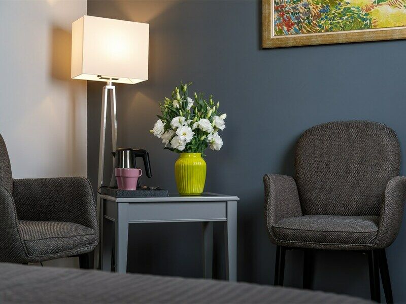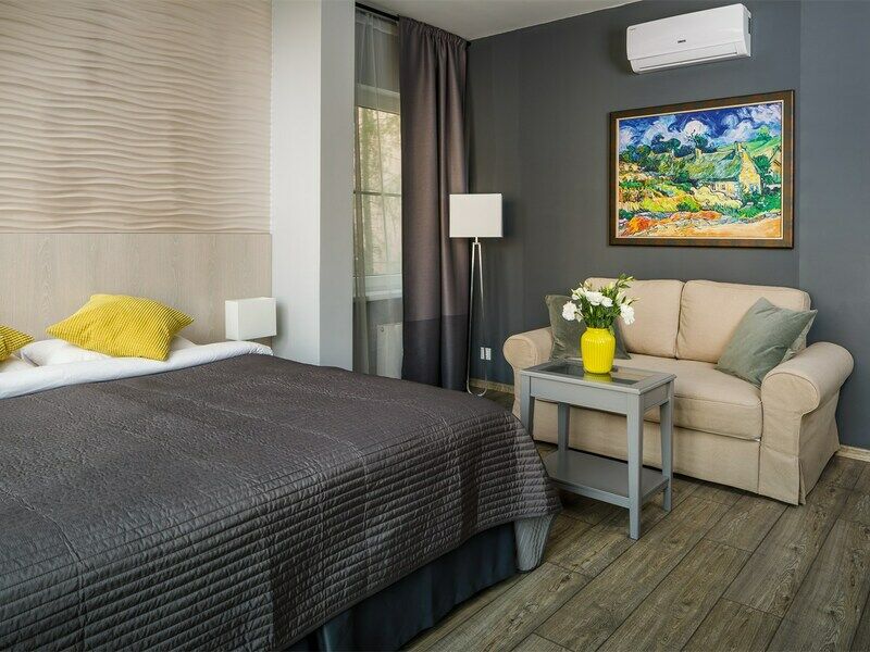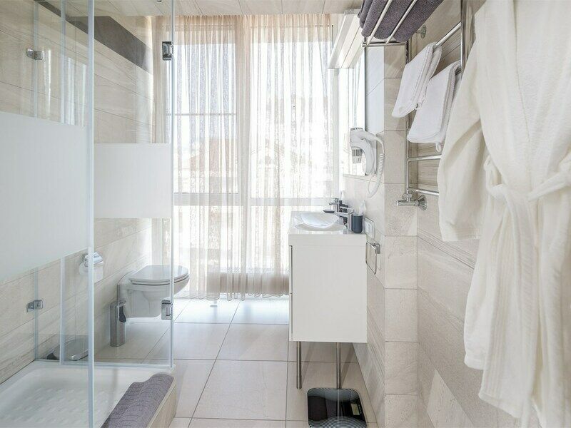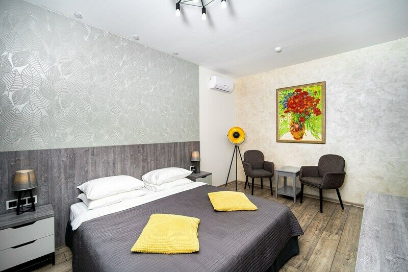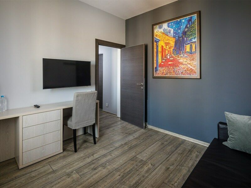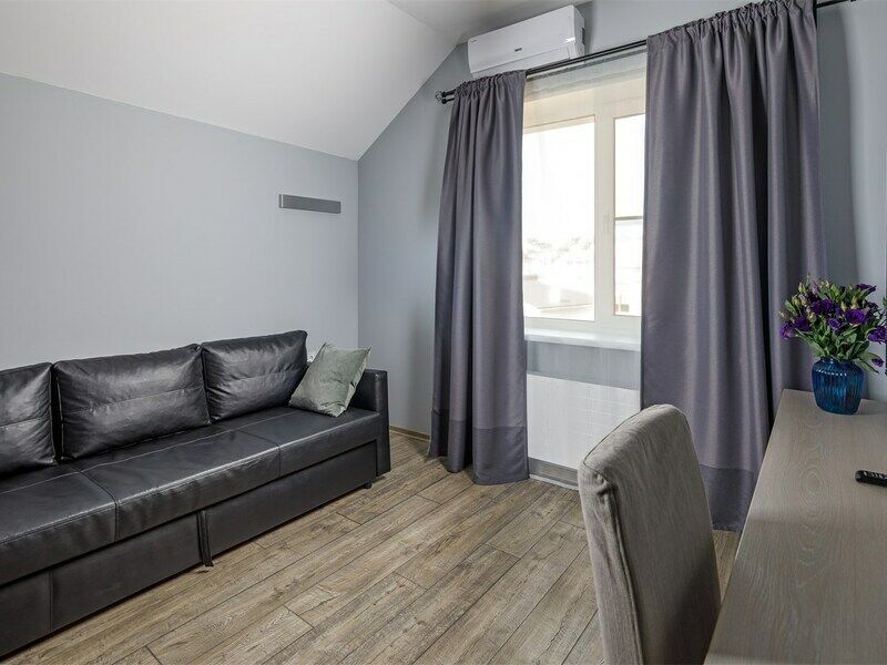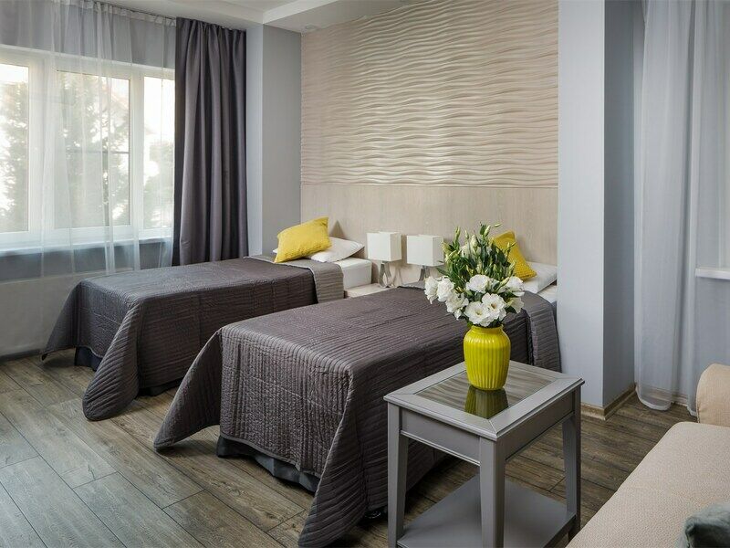 Современный пятиэтажный корпус отеля (без лифта) занимает небольшую благоустроенную территорию площадью 6000 кв.м. Небольшой жилой фонд предлагает гостям двухместные номера Стандарт и Люкс. Везде стильный лаконичный интерьер, выдержанный в спокойной гамме бело-серых оттенков с добавлением акцентного желтого. Все комнаты оснащены душем, кондиционером и техникой.