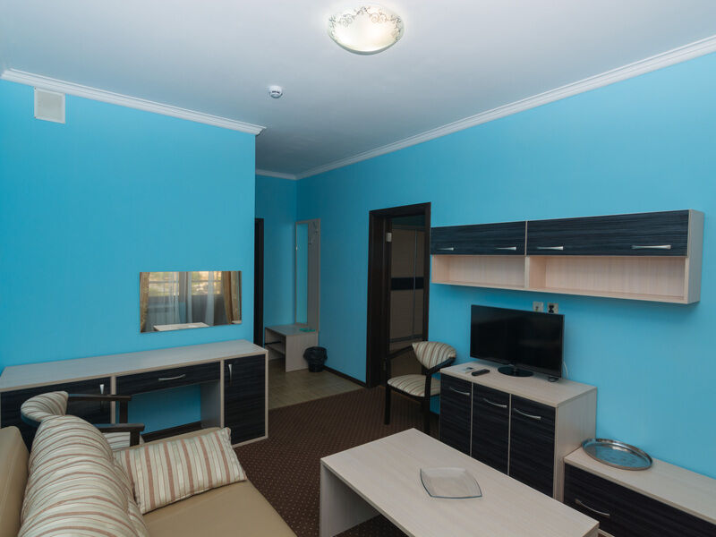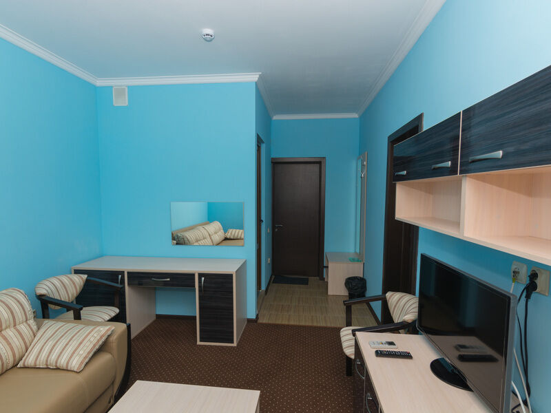 Спальный корпус состоит из трех этажей, на двух из которых разместился номерной фонд на 50 мест. Из номеров с балконами открывается захватывающий вид на море и горы. В номерах есть бесплатный WI-FI, телевизор, кондиционер, односпальные и двуспальные кровати, рабочие уголки и системы хранения – вместительные шкафы и комоды. Удобства можно дополнить взятыми напрокат бытовыми приборами: электрочайником, феном и утюгом.