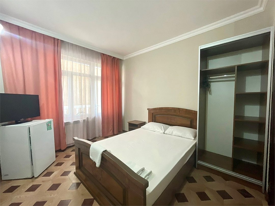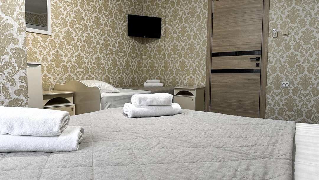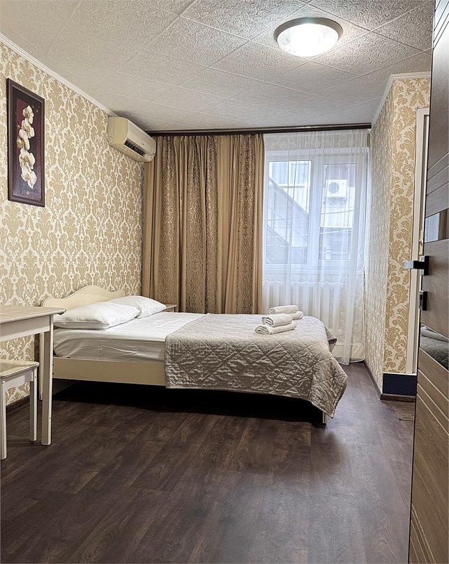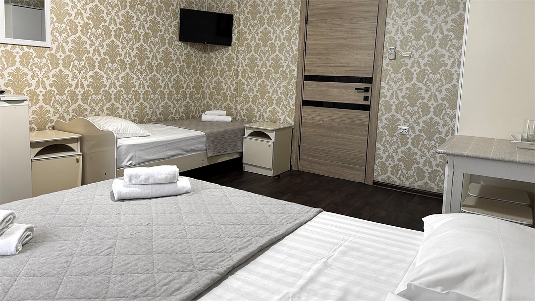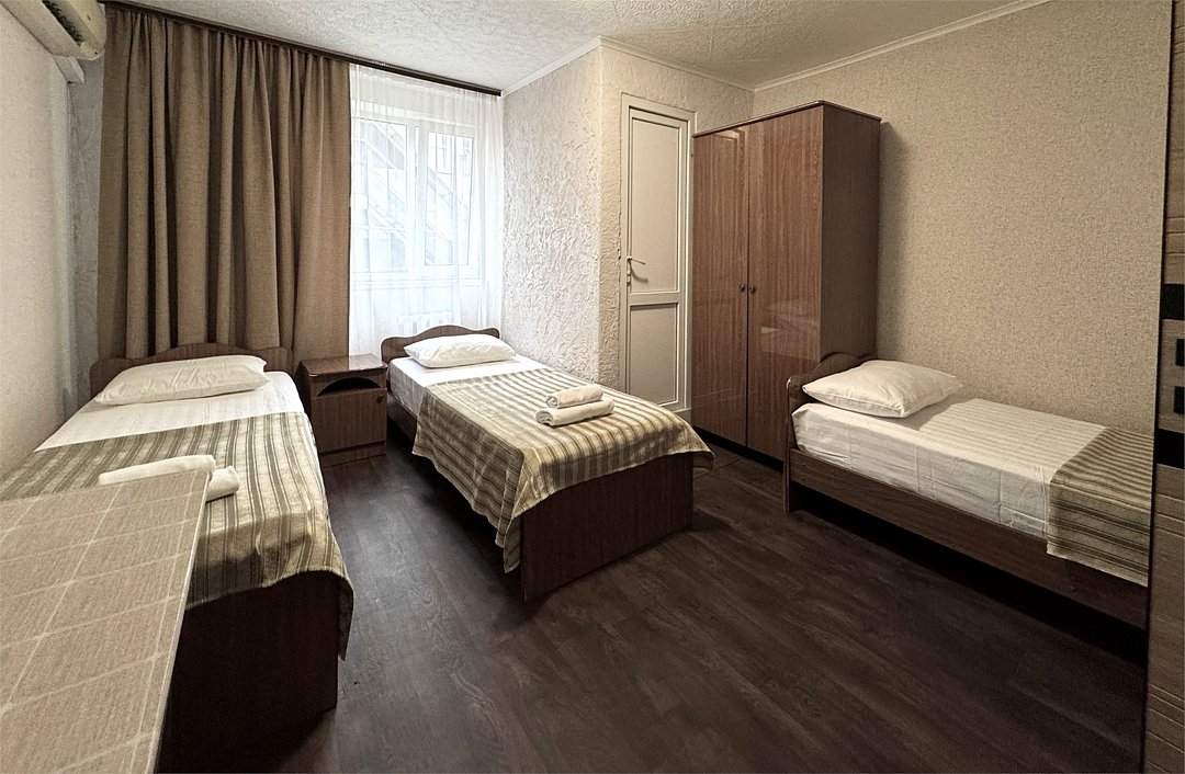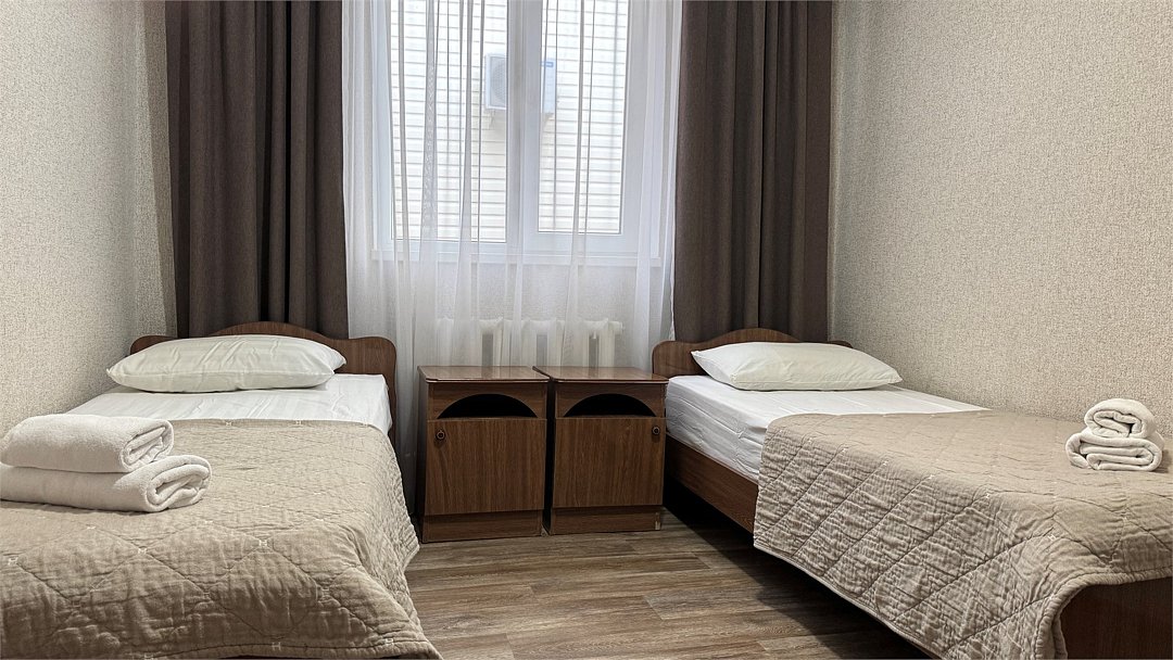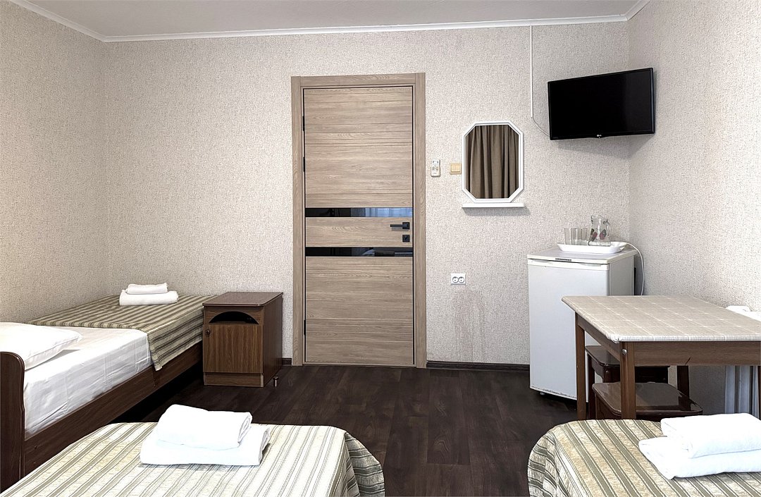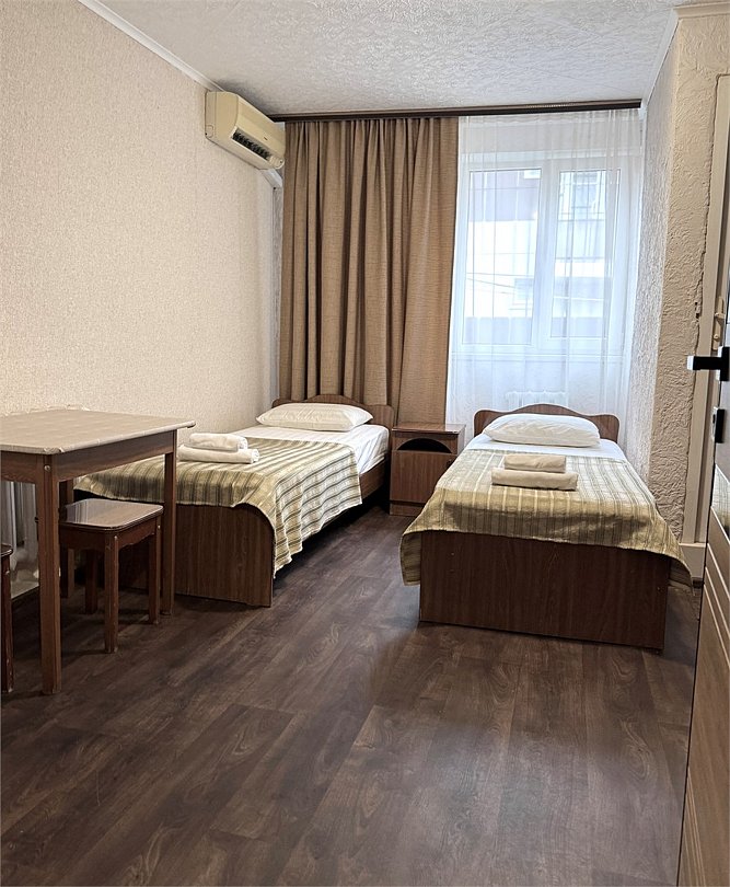 Просторные, светлые, уютные номера с двуспальной, односпальной и кресло-кроватью. Комнаты оборудованы всей необходимой мебелью и техникой – тв, холодильник, кондиционер. Санузел в номере. Кухня общая.Услуги и удобства