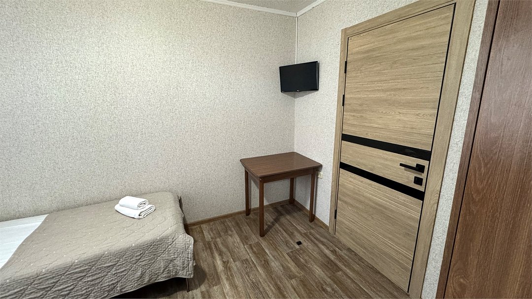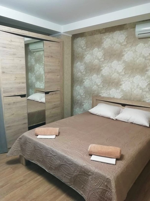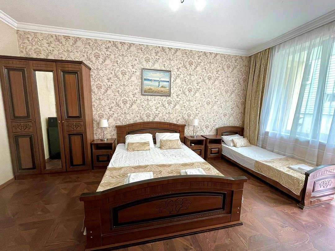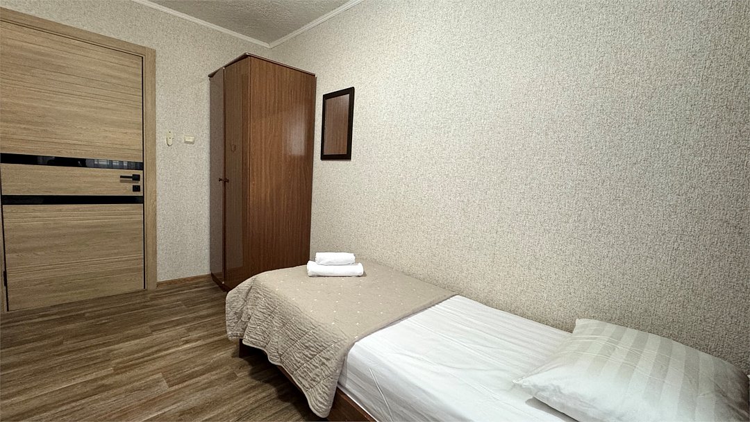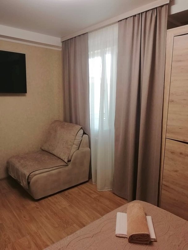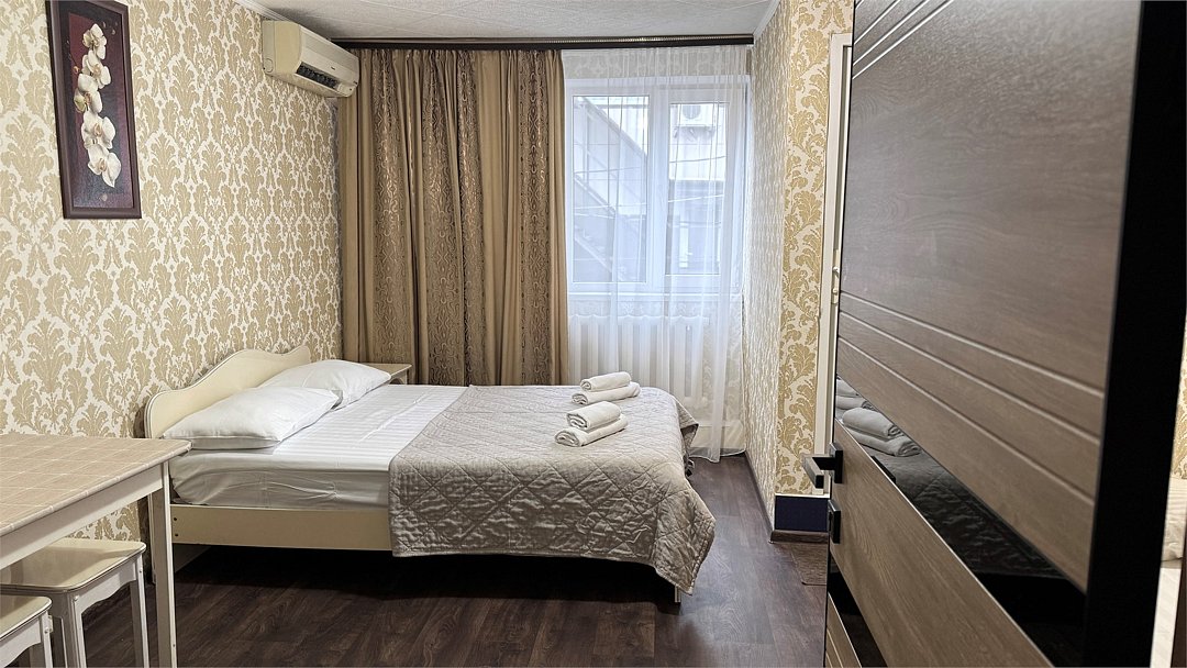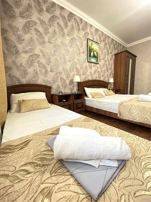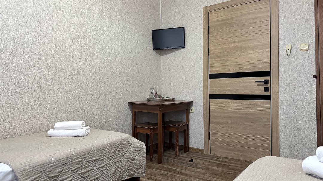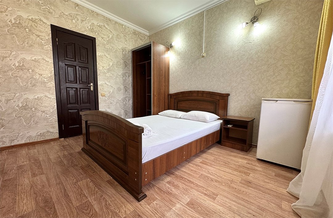 Просторные, светлые, уютные номера с двуспальной, односпальной и кресло-кроватью. Комнаты оборудованы всей необходимой мебелью и техникой – тв, холодильник, кондиционер. Санузел в номере. Кухня общая.Услуги и удобства