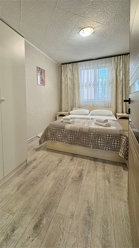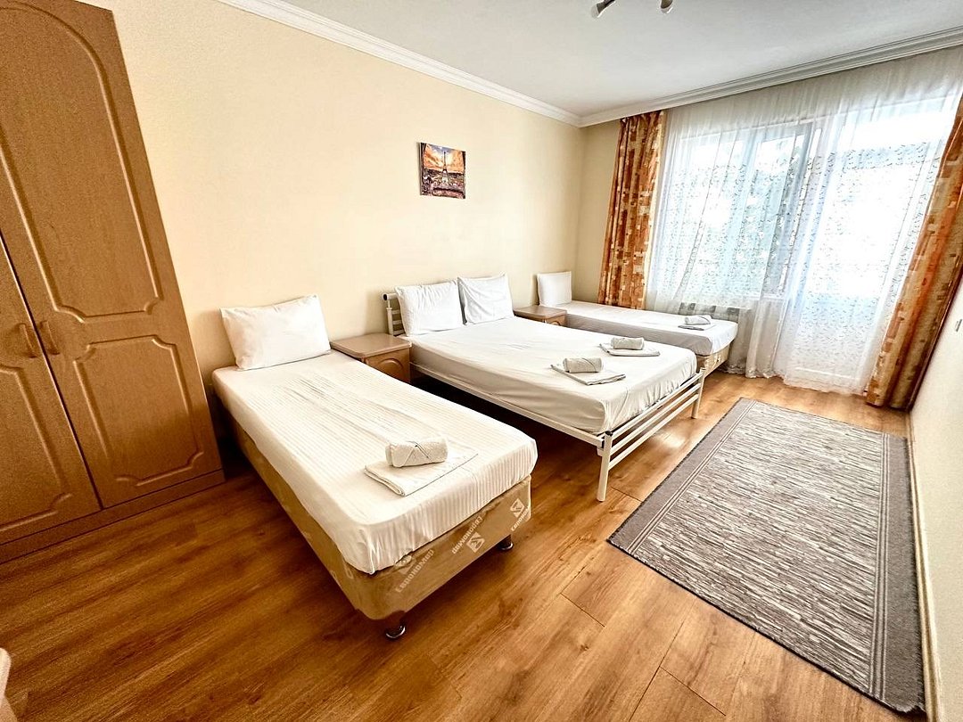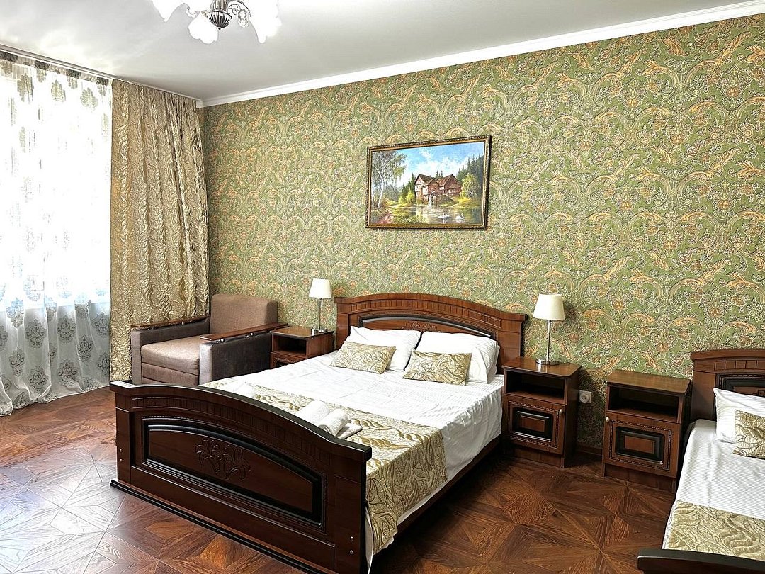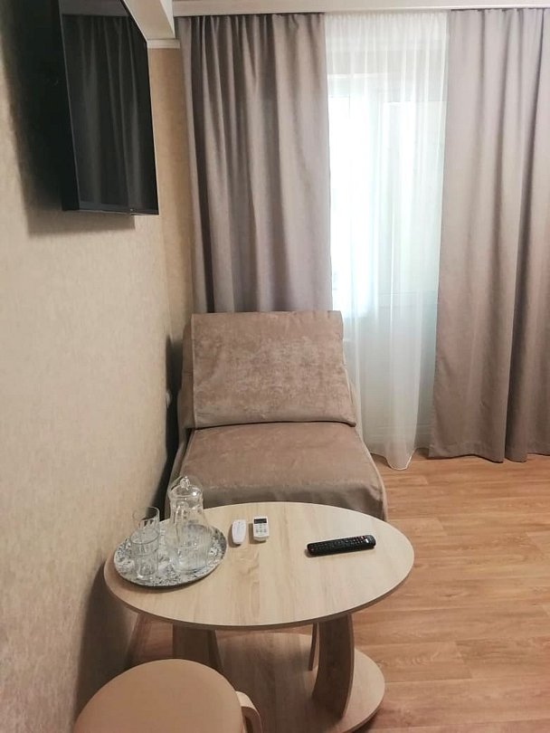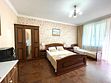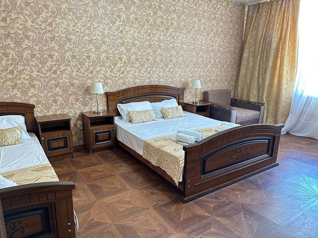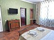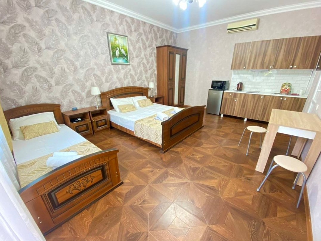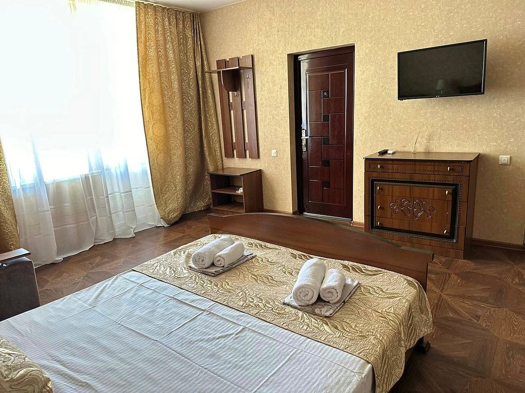 Просторные, светлые, уютные номера с двуспальной, односпальной и кресло-кроватью. Комнаты оборудованы всей необходимой мебелью и техникой – тв, холодильник, кондиционер. Санузел в номере. Кухня общая.Услуги и удобства