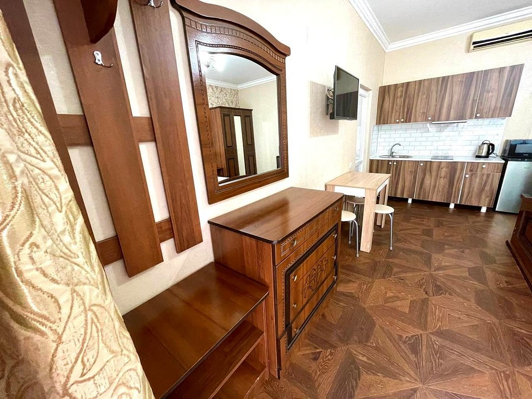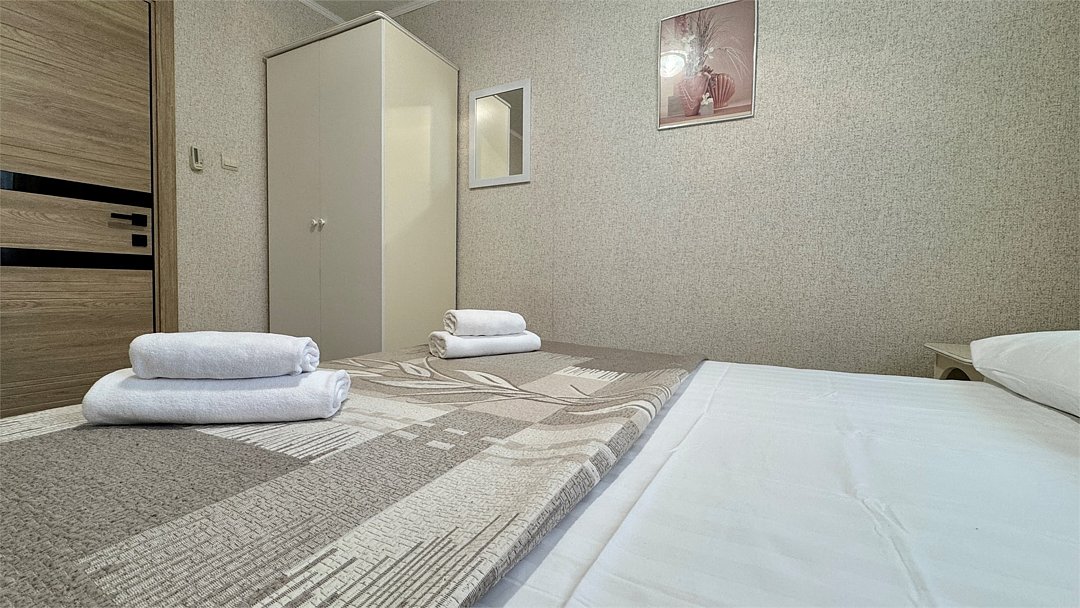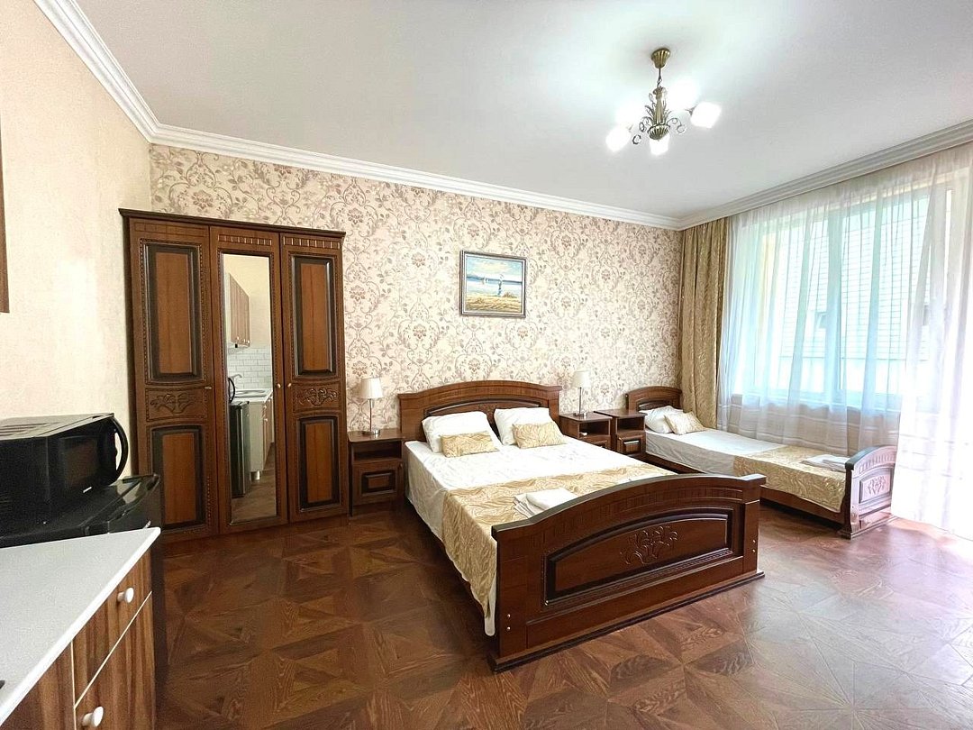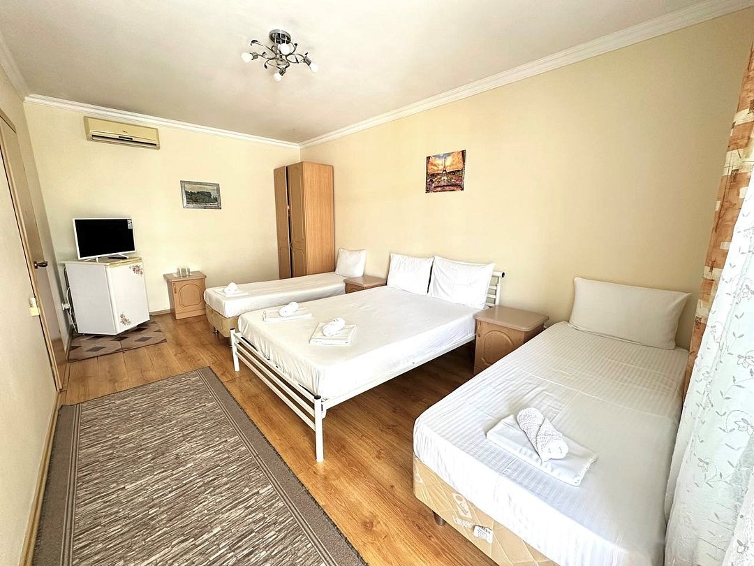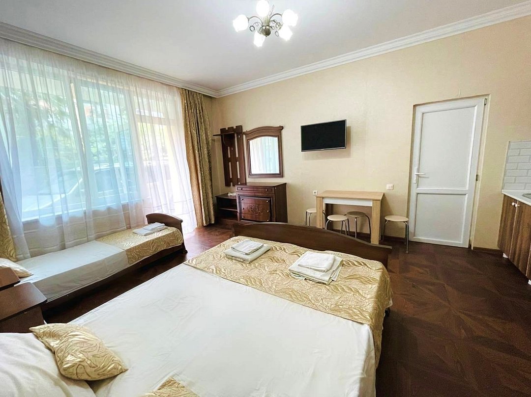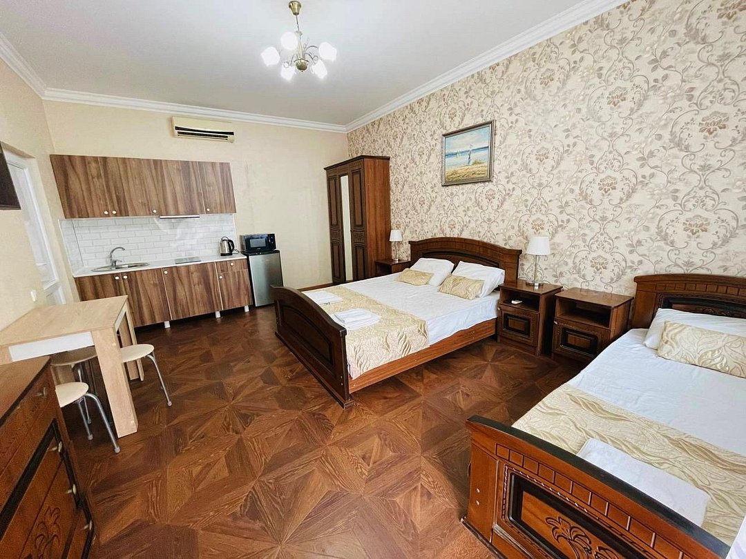 Уютный номер с балконом или террасой. Подходит для размещения семьи составом до 3-4х человек. Кровати - двуспальная, односпальная. Сан узел в номере. В комнате вся необходимая мебель и техника - тв, кондиционер, холодильник. Собственная кухня со всем необходимым для приготовления вкусной еды.Услуги и удобства