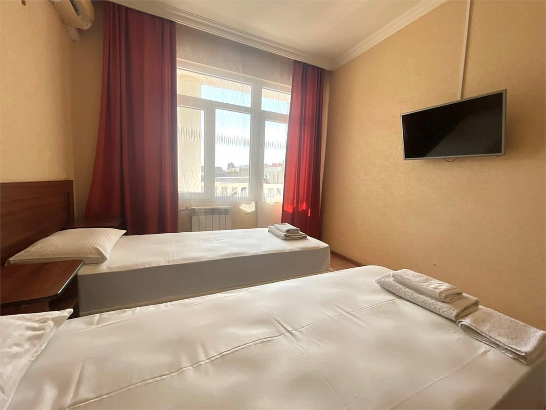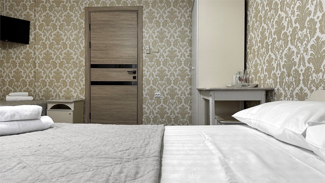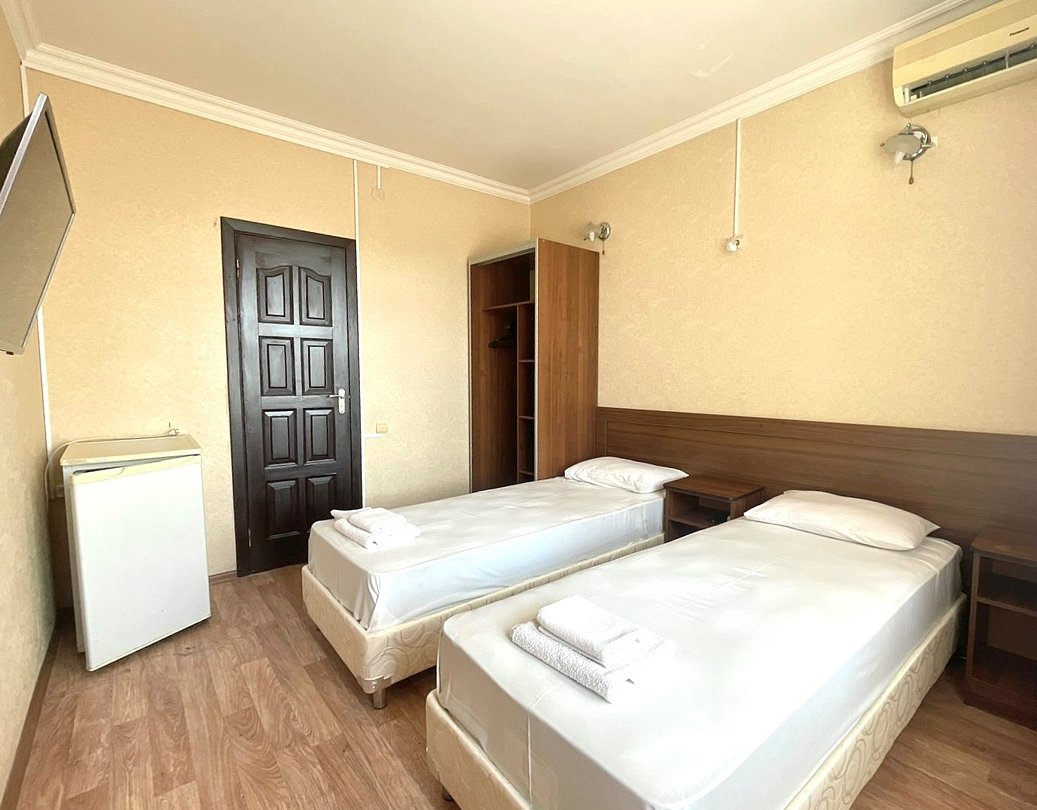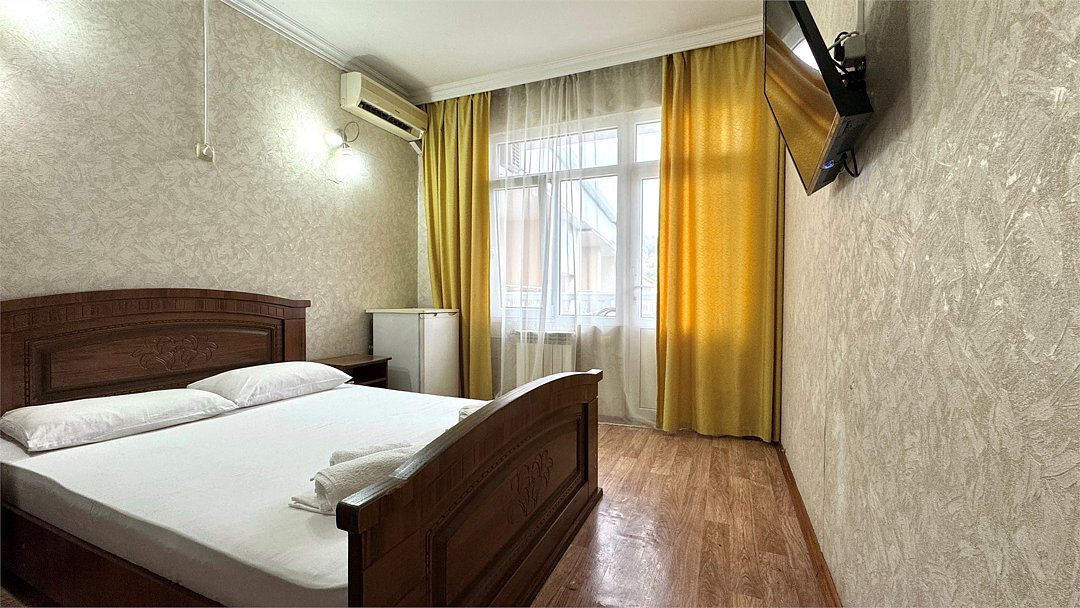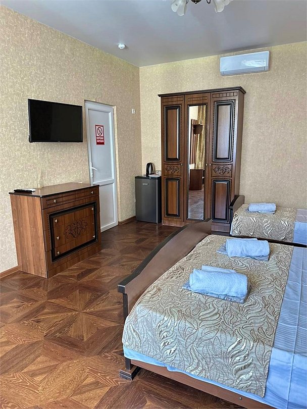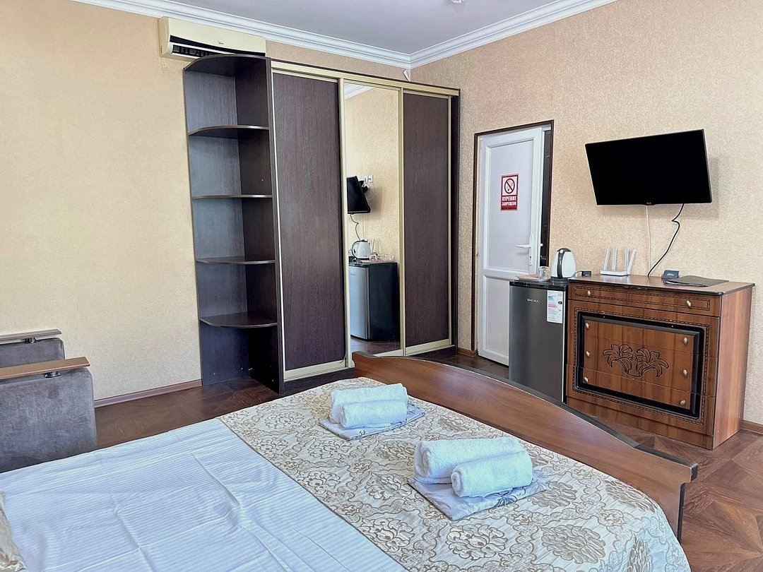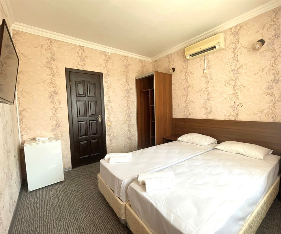 Wi-Fi, холодильник, кондиционер, ванная комната, банные полотенца, две односпальные или большая двуспальная кровать, гардеробная, вешалки, вид во двор, тумба, телевизор с плоским экраном, мыло, без питомцевВ гостиничном номере