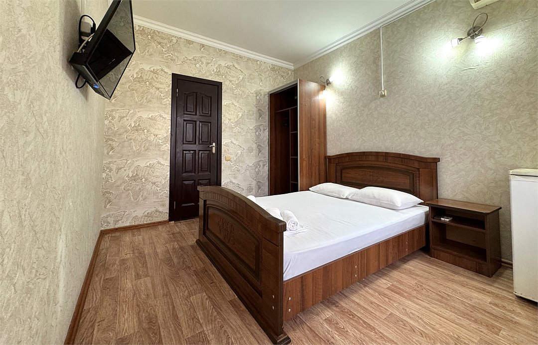 Уютные номера, оборудованные всей необходимой мебелью и техникой – тв, холодильник, кондиционер. Сан узел в номере. Кухня общая. Размещение – двуспальные, односпальные кровати.Услуги и удобства