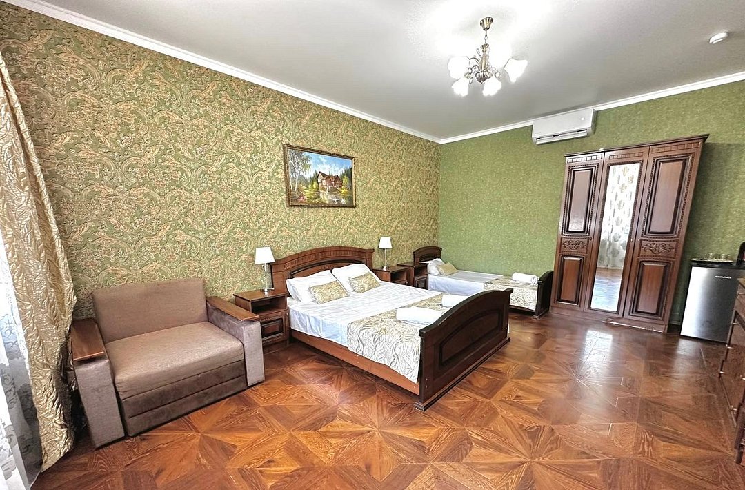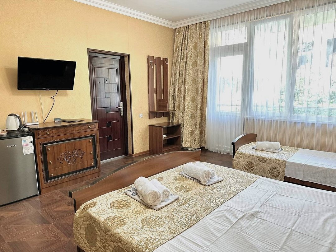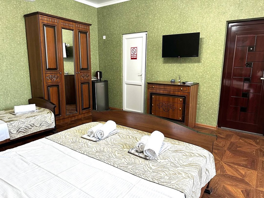 Wi-Fi, холодильник, кондиционер, ванная комната, банные полотенца, двуспальная кровать, две односпальные кровати, гардеробная, вешалки, вид во двор, тумба, телевизор с плоским экраном, мыло, без питомцевВ гостиничном номере