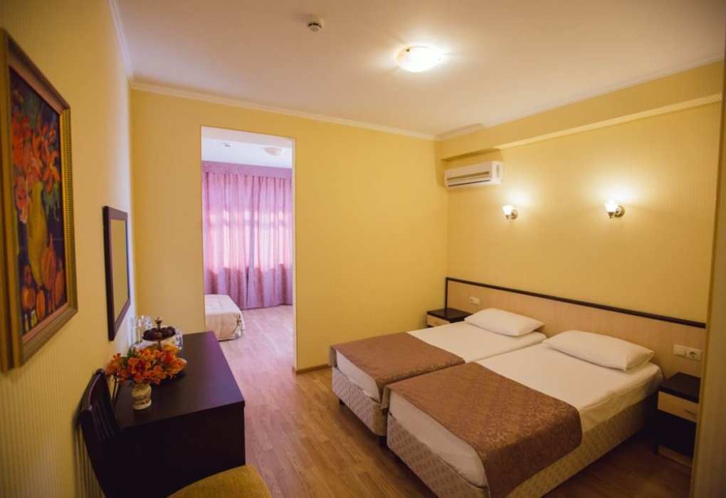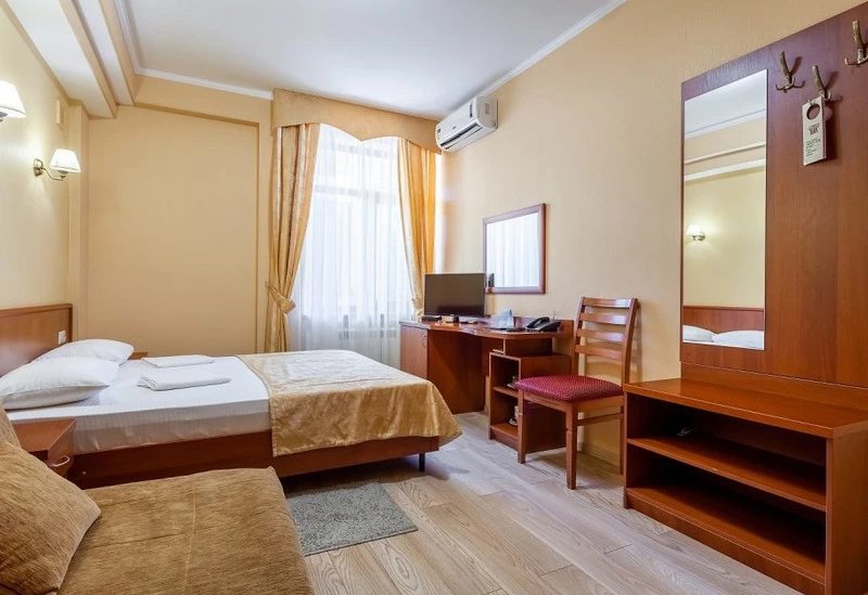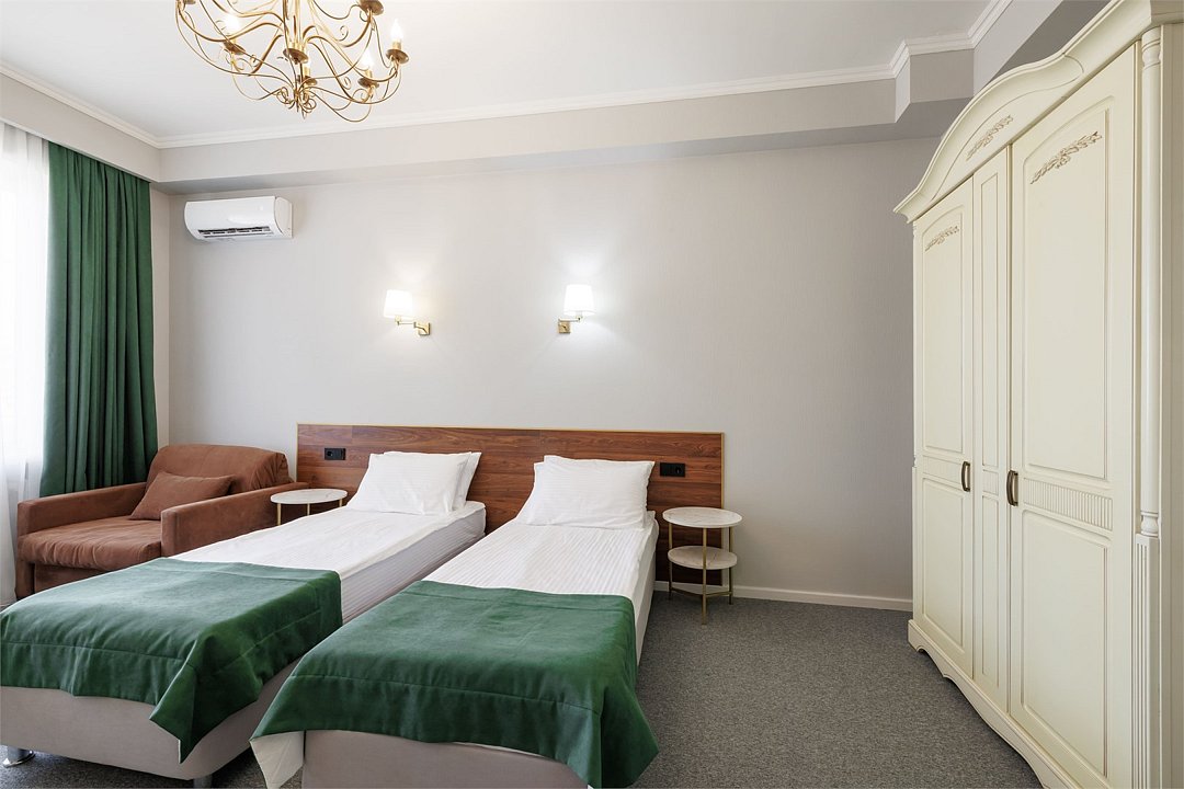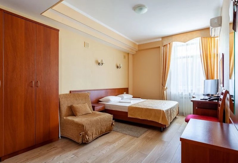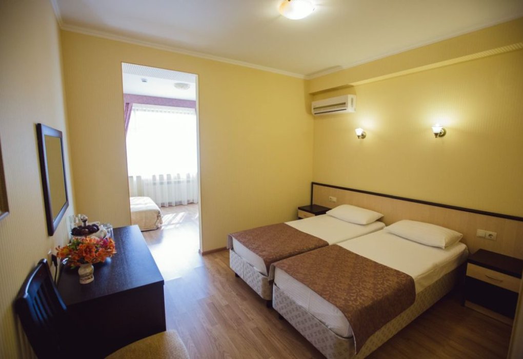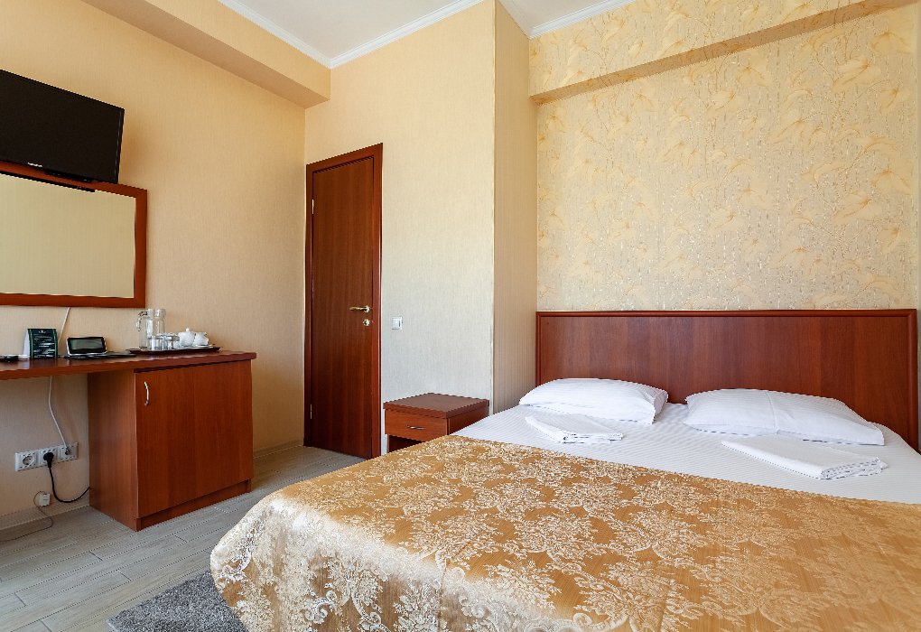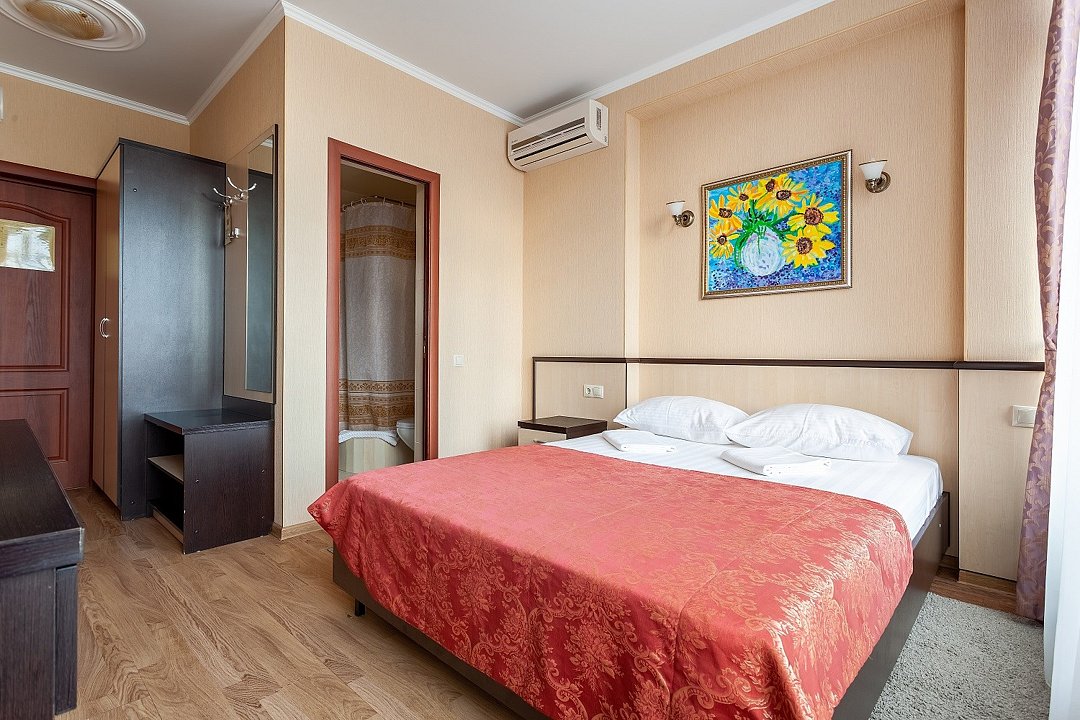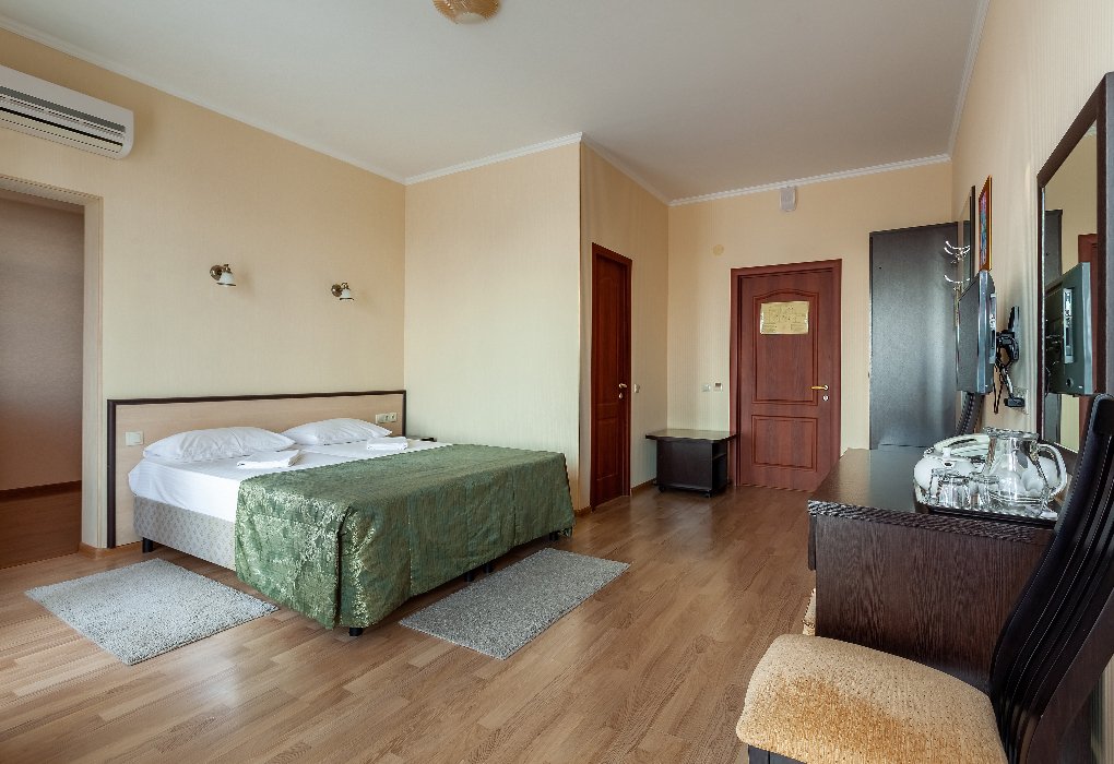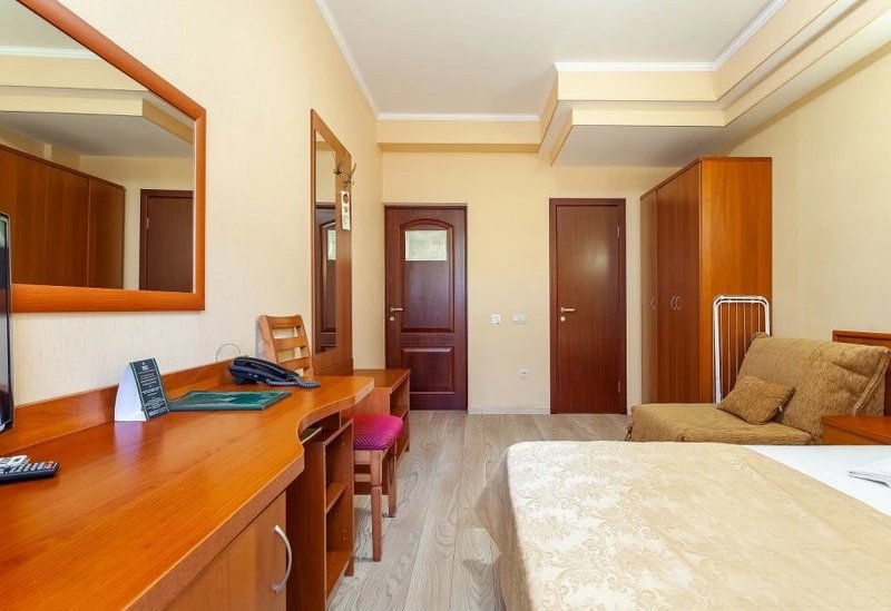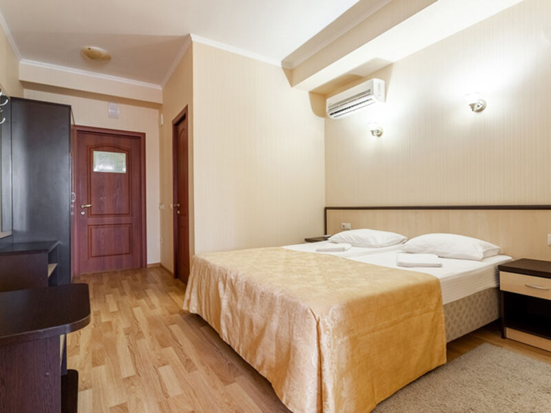 Стандарт Улучшенный ББ 1-комнатный, 2-х местный площадь 20 кв.м. 2 доп места (диван) *предоставляется за доп.плату * Проживание детей до 4 лет бесплатно КОМПЛЕКТАЦИЯ НОМЕРА: ● Кровать ● Шкаф ● Настенное зеркало ● Прикроватная тумба ● Диван или кресло ● Часы ● Прихожая ● Телевизор с плоским экраном ● Холодильник ● Сплит-система ● Телефон ● Посуда(2 стакана, графин) ● Душевая кабина, туалет, раковина ● Гигиенические принадлежности ● Сушилка ● Душевая кабина, туалет, раковина ● ФенУслуги и удобства