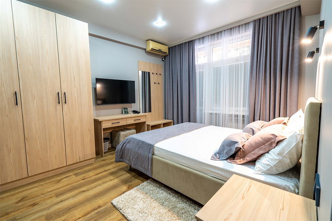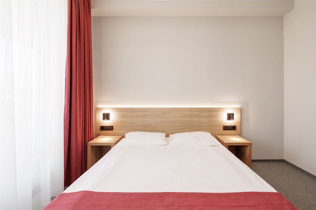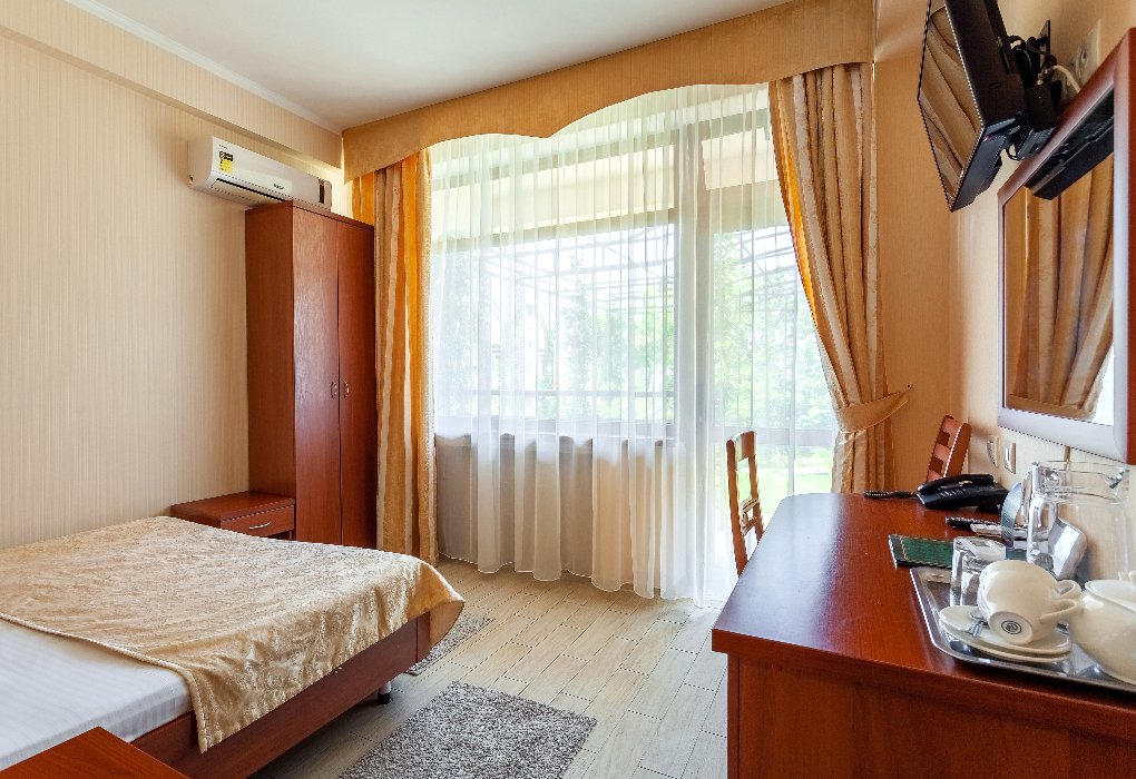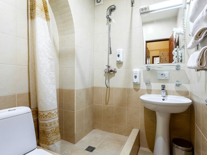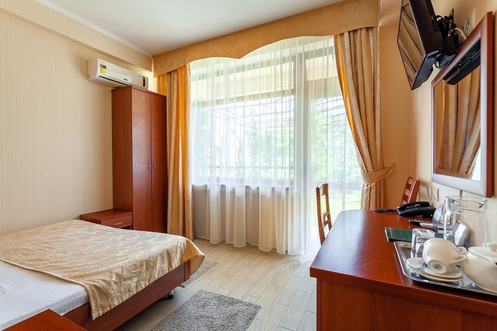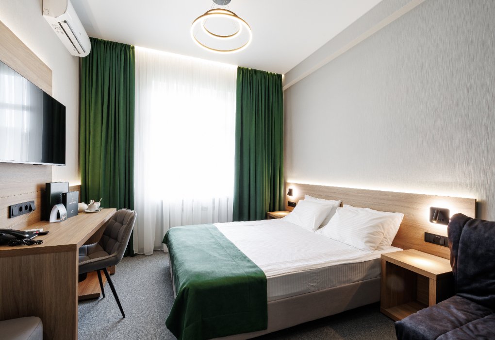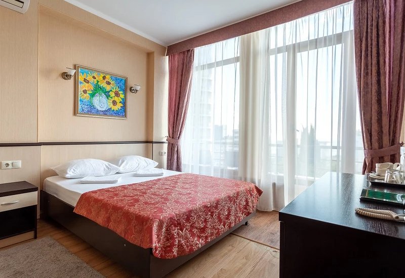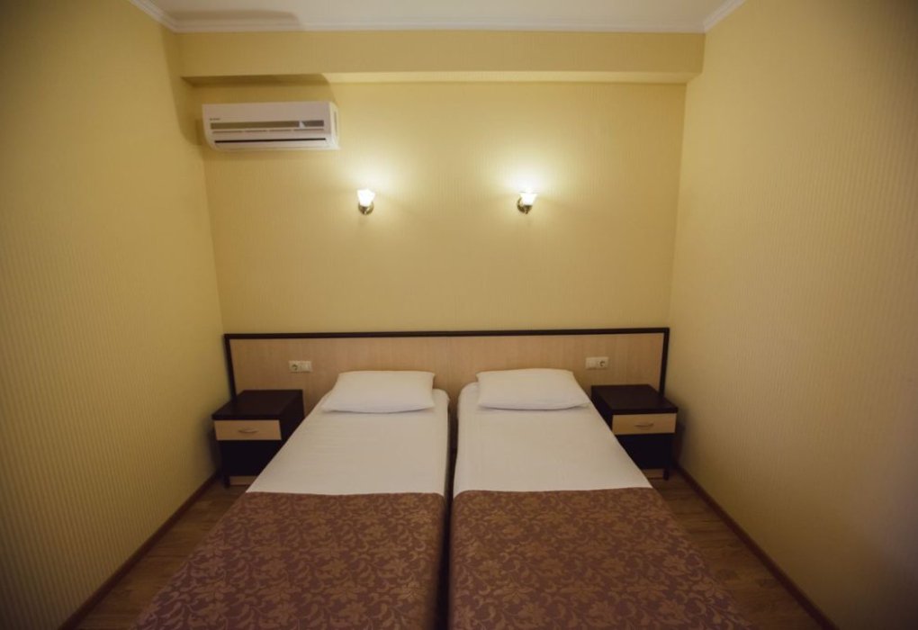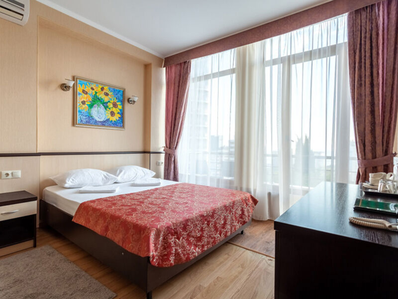 Стандарт Улучшенный ББ 1-комнатный, 2-х местный площадь 20 кв.м. 2 доп места (диван) *предоставляется за доп.плату * Проживание детей до 4 лет бесплатно КОМПЛЕКТАЦИЯ НОМЕРА: ● Кровать ● Шкаф ● Настенное зеркало ● Прикроватная тумба ● Диван или кресло ● Часы ● Прихожая ● Телевизор с плоским экраном ● Холодильник ● Сплит-система ● Телефон ● Посуда(2 стакана, графин) ● Душевая кабина, туалет, раковина ● Гигиенические принадлежности ● Сушилка ● Душевая кабина, туалет, раковина ● ФенУслуги и удобства