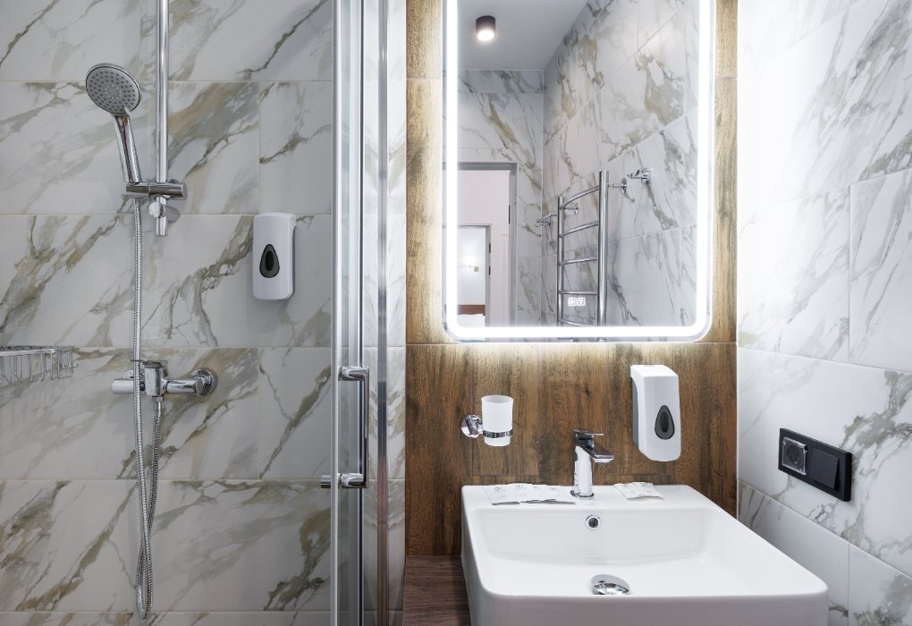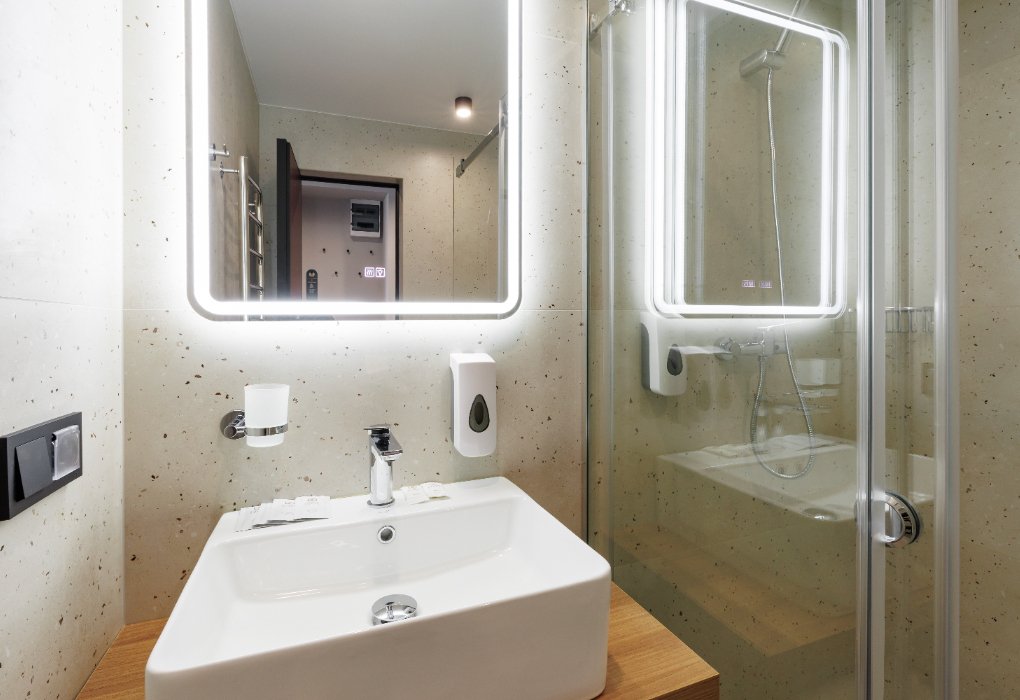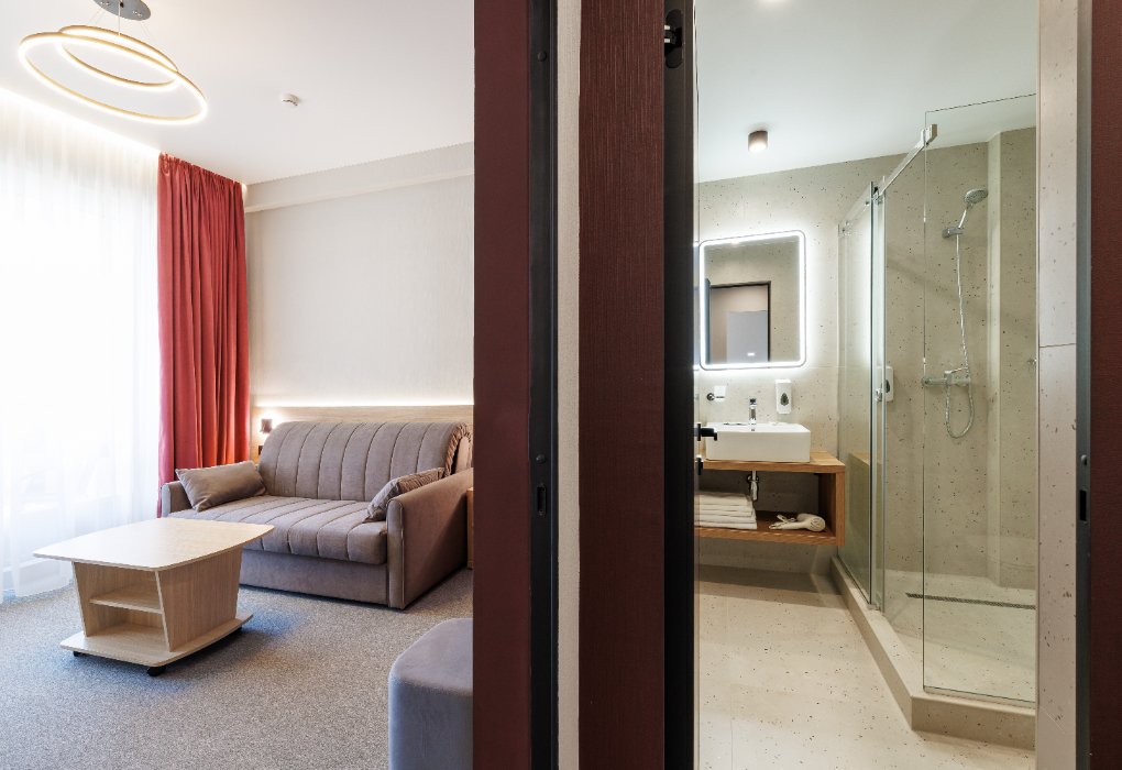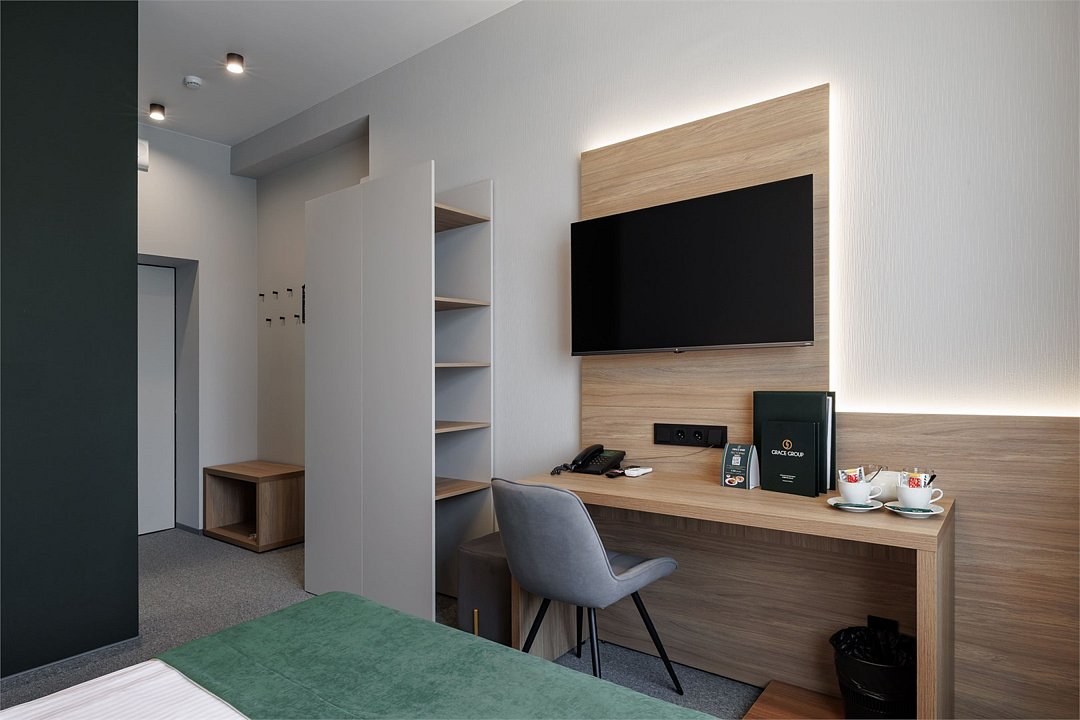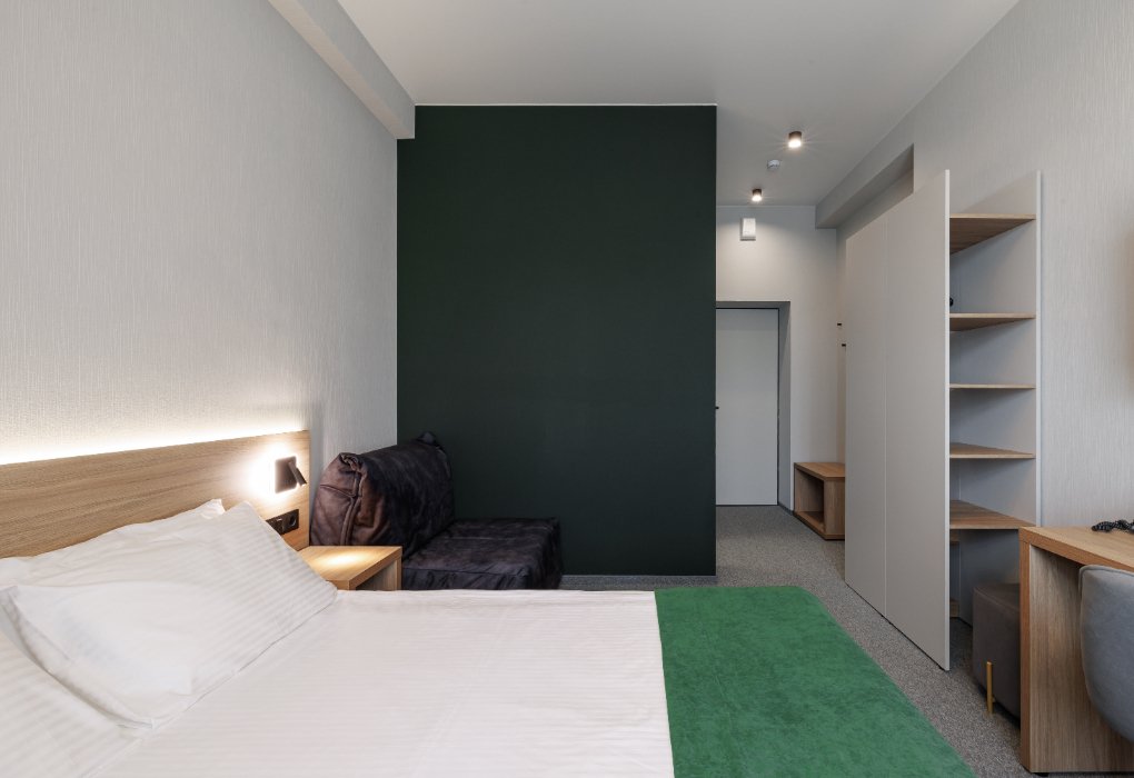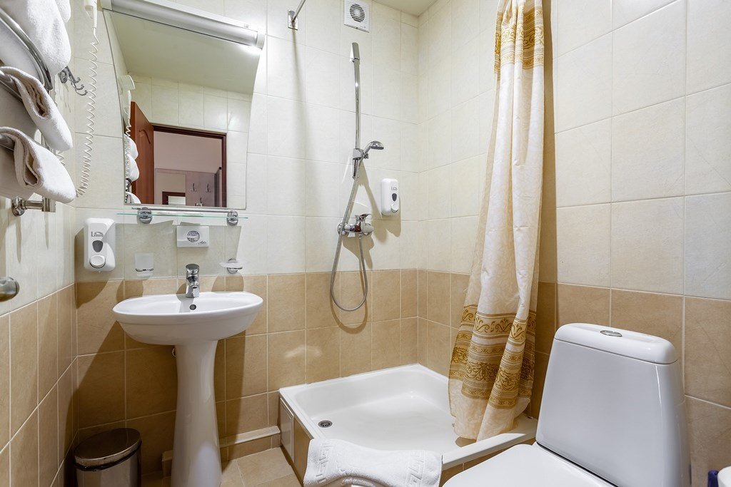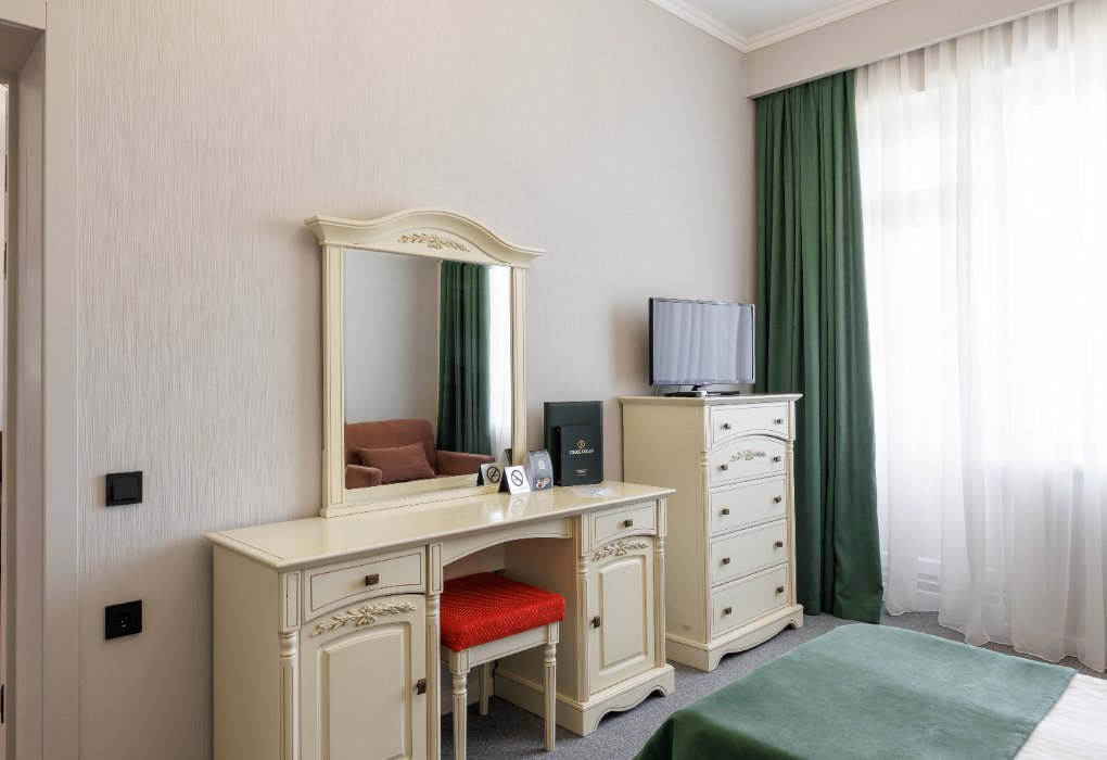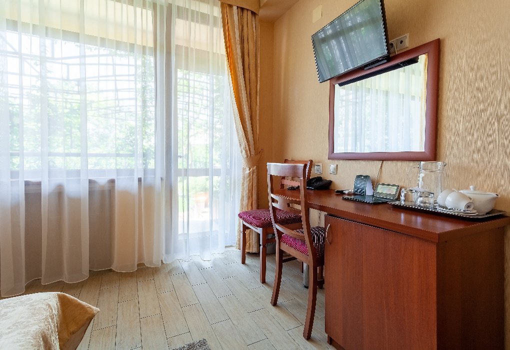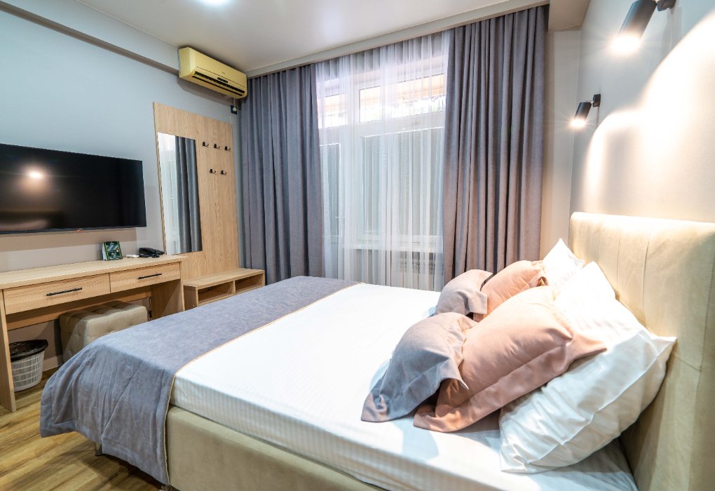 Стандарт Улучшенный ББ 1-комнатный, 2-х местный площадь 20 кв.м. 2 доп места (диван) *предоставляется за доп.плату * Проживание детей до 4 лет бесплатно КОМПЛЕКТАЦИЯ НОМЕРА: ● Кровать ● Шкаф ● Настенное зеркало ● Прикроватная тумба ● Диван или кресло ● Часы ● Прихожая ● Телевизор с плоским экраном ● Холодильник ● Сплит-система ● Телефон ● Посуда(2 стакана, графин) ● Душевая кабина, туалет, раковина ● Гигиенические принадлежности ● Сушилка ● Душевая кабина, туалет, раковина ● ФенУслуги и удобства