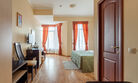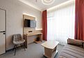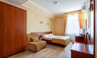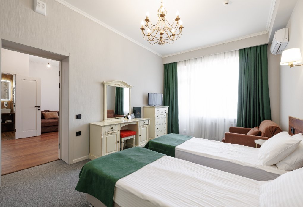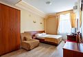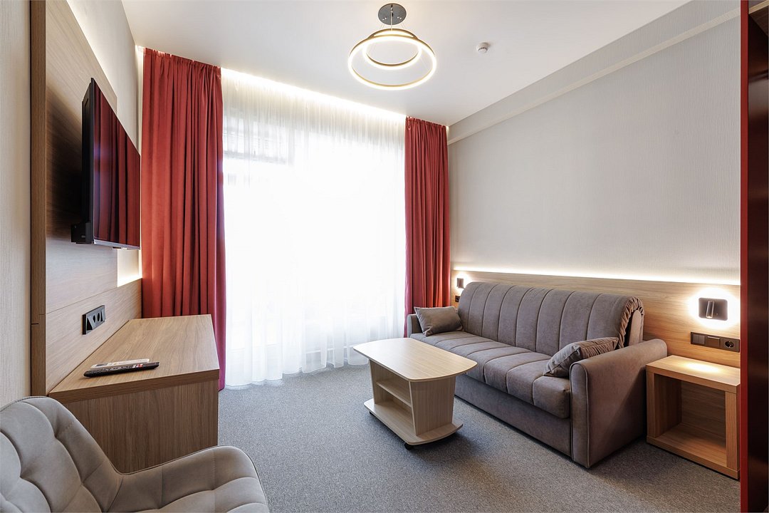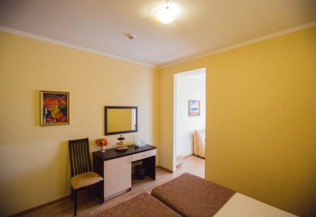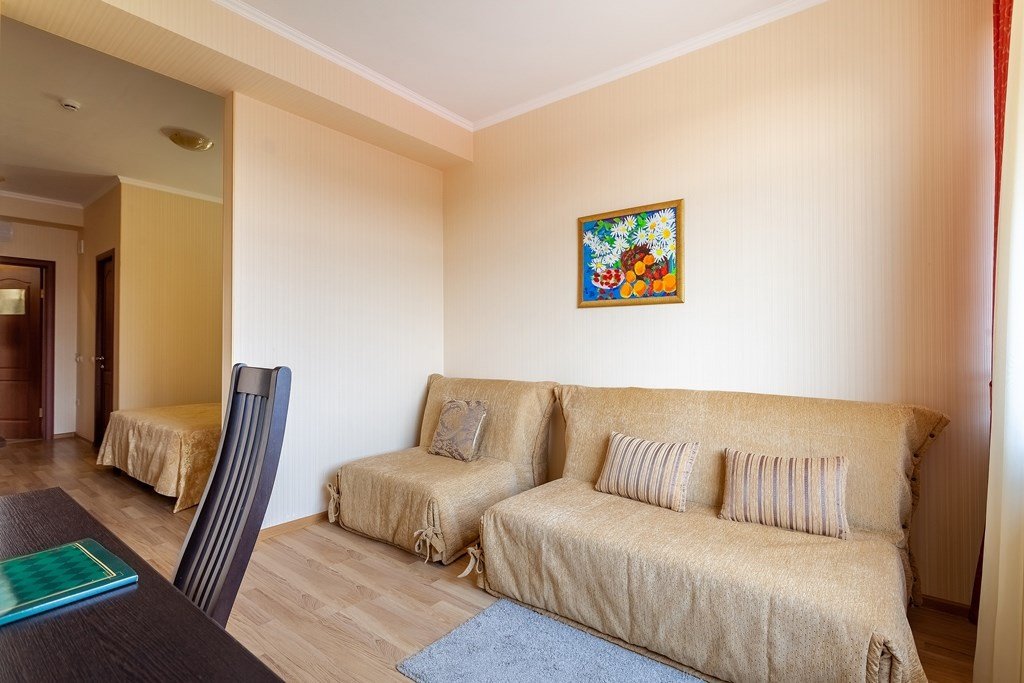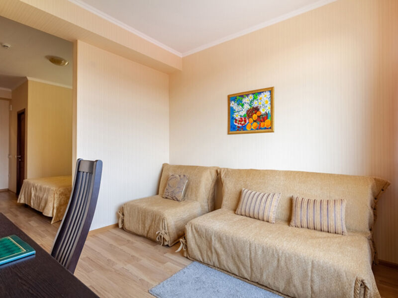 Делюкс 2-комнатный, 2-х местный площадь 24 кв.м. 3 доп места (диван) (кресло) *предоставляется за доп.плату * Проживание детей до 4 лет бесплатно КОМПЛЕКТАЦИЯ НОМЕРА: ● Кровать (Одна двуспальная или две раздельные) ● Прикроватная тумба ● Телевизор с плоским экраном ● Сплит-система ● Диван-кровать ● Кресло ● Журнальный столик ● Часы ● Настенное зеркало ● Шкаф ● Прихожая (Шкаф для одежды, обувница, рожок, щетка и губка для обуви) ● Холодильник ● Посуда (поднос, чайная пара, 2 стакана ● Душевая,туалет, раковина ● Фен ● Тапочки ● Гигиенические принадлежностиУслуги и удобства