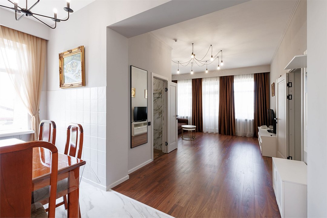 Комфортабельный номер 36 кв м с современным ремонтом и собственной кухней. Номер делюкс находится на цокольном этаже отеля. * Проживание детей до 4 лет бесплатноУслуги и удобства