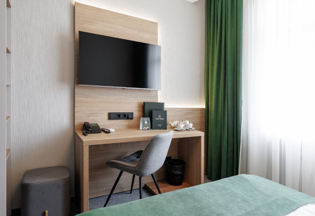 телевизор, Wi-Fi, телефон, кондиционер, фен, будильник, ванная комната, банные полотенца, пляжные полотенца, тапочки, гигиенические средства, двуспальная кровать, стулья, шкаф для одежды, вешалки, письменный стол, зеркало, раковина, отопление, душ, кулер на этаже, стаканы, стул, туалетный столик, мини-холодильник, уборка номера, без питомцевВ номере
