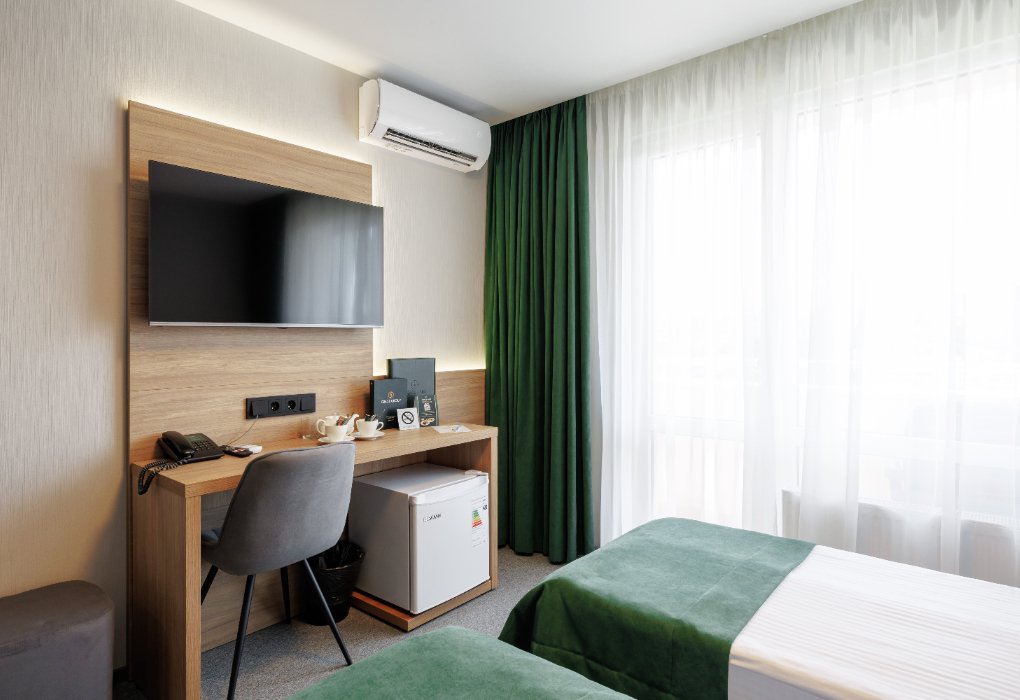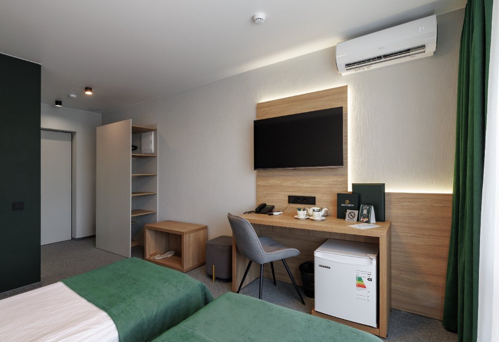 телевизор, Wi-Fi, телефон, кондиционер, фен, будильник, ванная комната, банные полотенца, пляжные полотенца, тапочки, гигиенические средства, две односпальные кровати, стулья, зеркало, душ, кулер на этаже, туалетный столик, раскладной диван, раскладное кресло, мини-холодильник, уборка номера, без питомцевВ номере