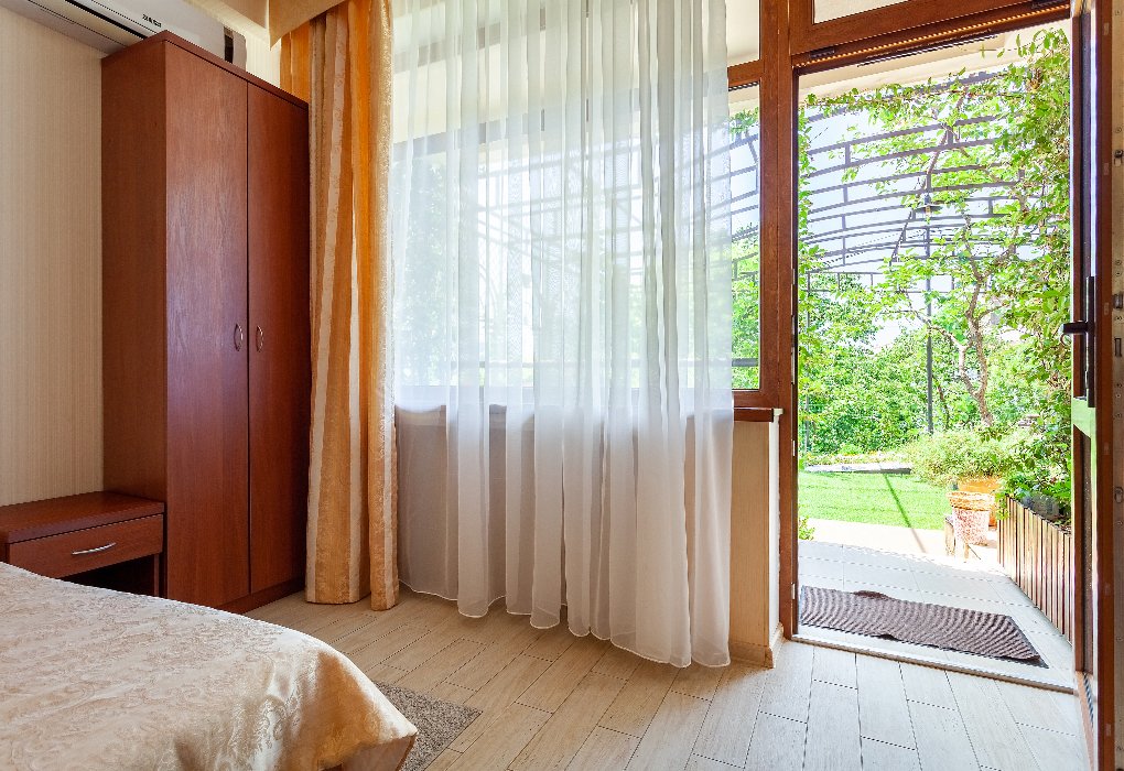 телевизор, Wi-Fi, телефон, кондиционер, фен, микроволновая печь, утюг, душевая кабина, банные принадлежности, банные полотенца, тапочки, двуспальная кровать, гладильная доска, тумбы, стулья, шкаф для одежды, вешалки, зеркало, мебельный гарнитур, кухня, набор посуды, чайник, унитаз, раковина, отопление, отдельный вход в номер, душ, стаканы, столовые приборы, стол, туалет, диван-кровать, мини-холодильник, кресло-кровать, без питомцевВ номере