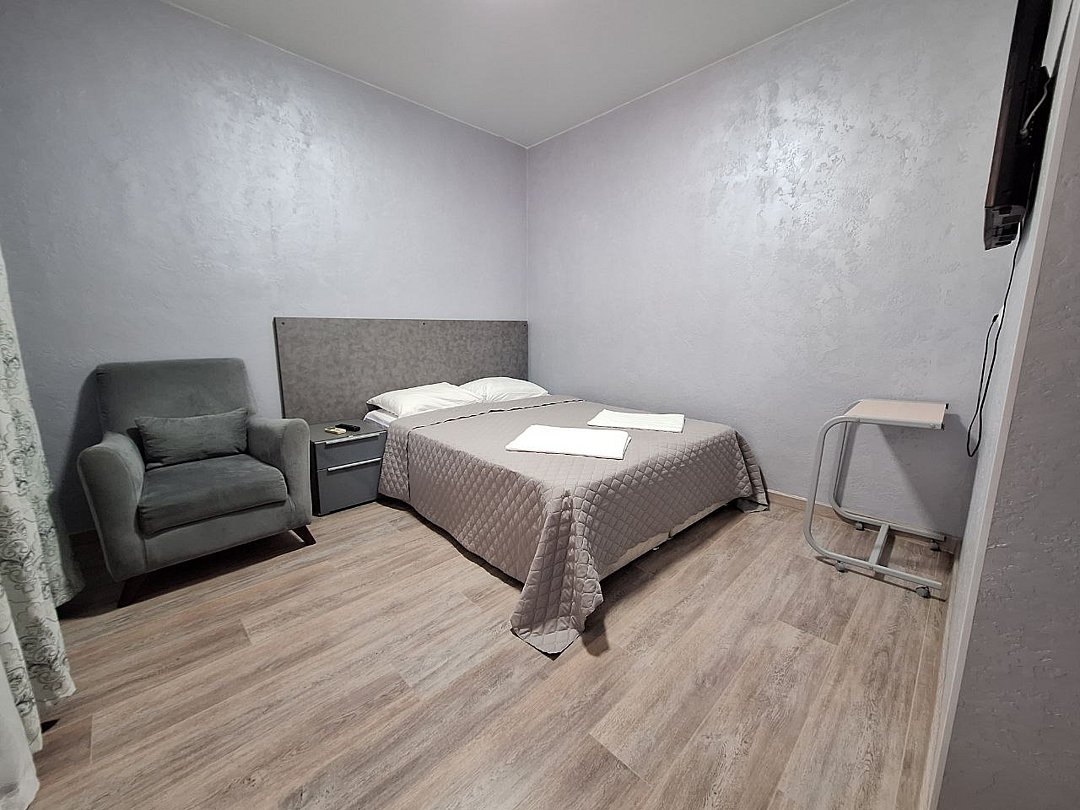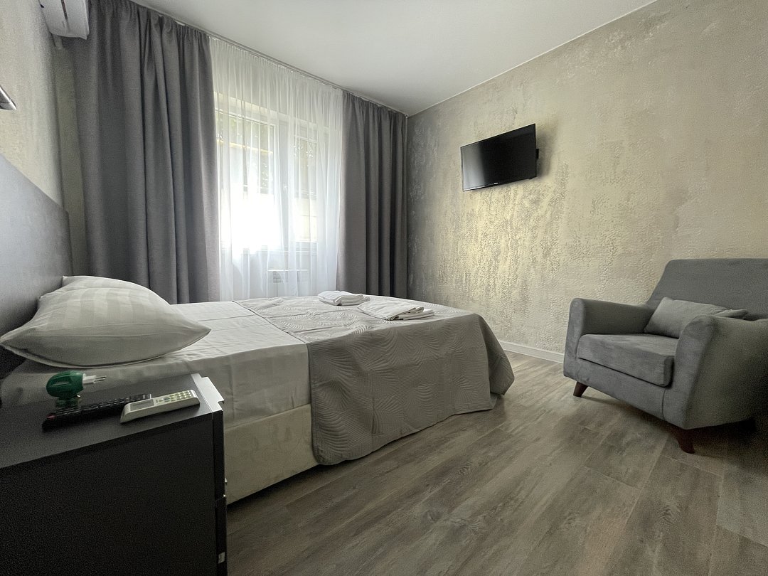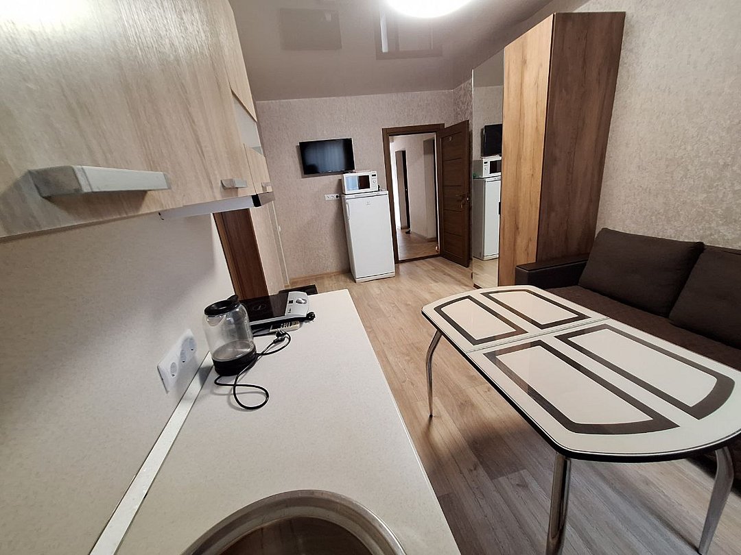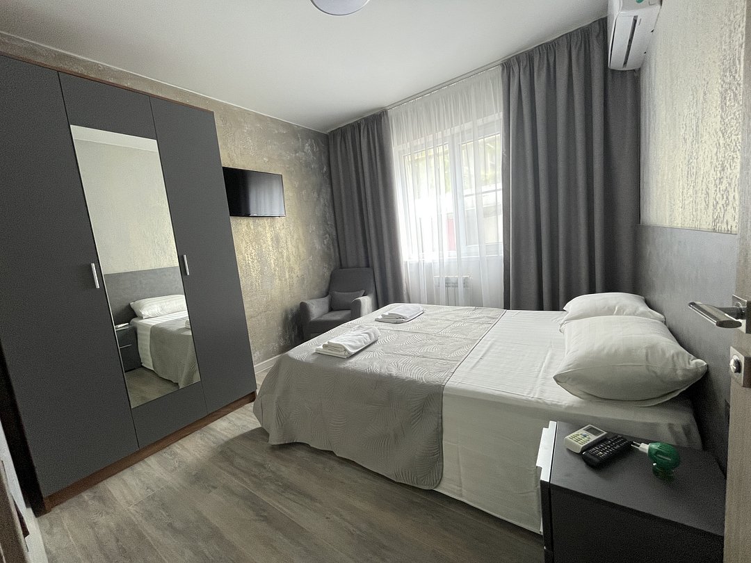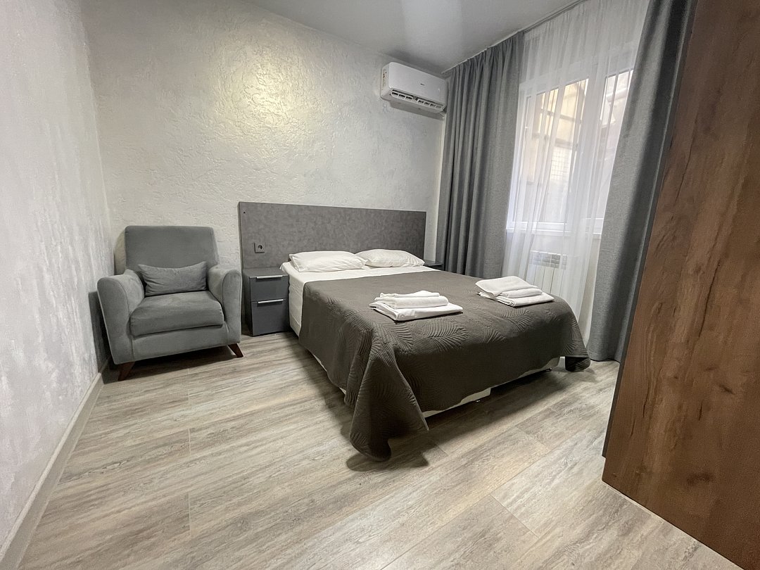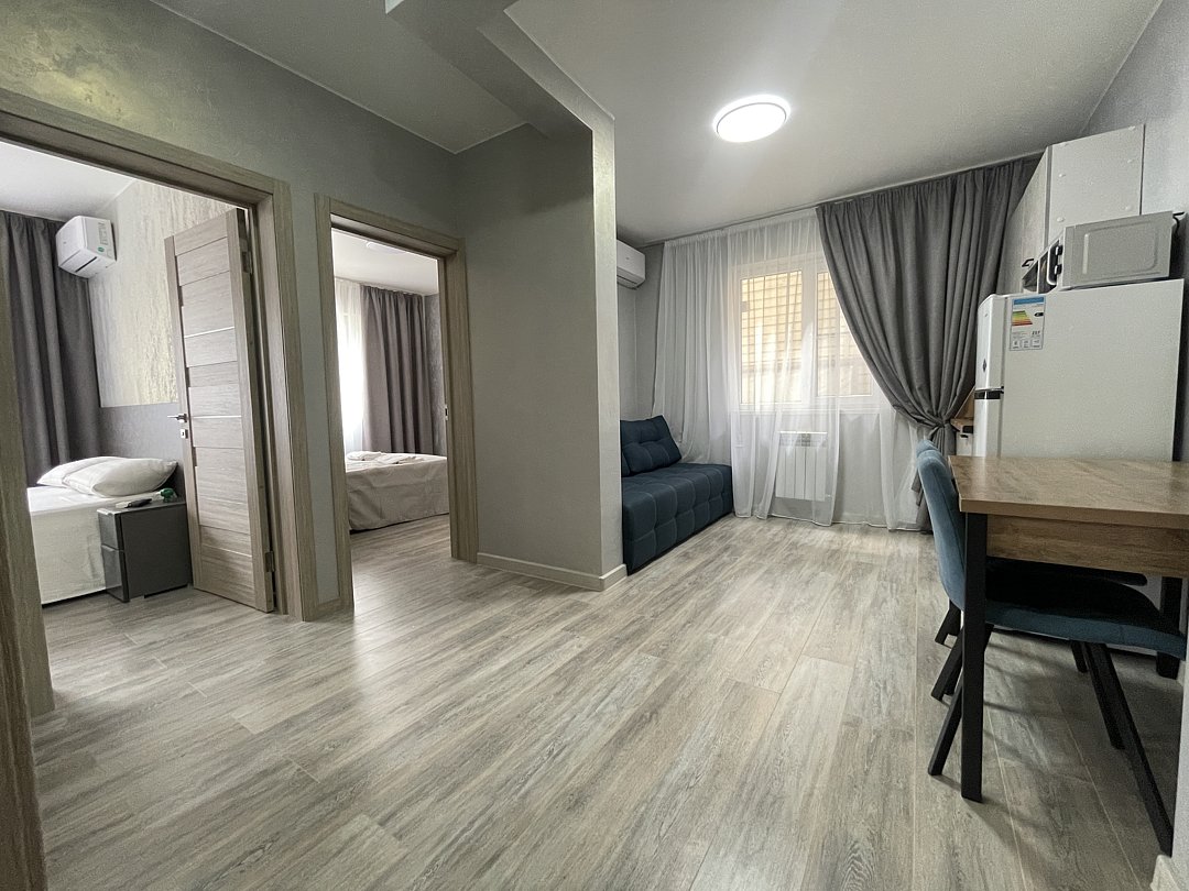 2-х комнатный Семейный - Свежий ремонт и стильный дизайн интерьера обеспечат вам уют и гармонию, а просторная площадь в 25 кв. метров позволит чувствовать себя свободно и комфортно. - Ваше пребывание будет еще более приятным благодаря наличию собственной кухни, где вы сможете наслаждаться вкусной домашней едой, не выходя из номера. - Вас ждет 1 спальня и кухня-гостиная с диваном, который легко трансформируется в дополнительное спальное место для размещения гостей. - Это идеальное решение для семей и компаний друзей, которые хотят провести время вместе и наслаждаться общением. - Душевая комната, где вы найдете все необходимые принадлежности для комфортного и приятного принятия душа. - Кроме того, Семейный номер оснащен сплит-системой, которая позволит вам наслаждаться прохладой в жаркие дни и теплом в холодные вечера. - Вы не останетесь без доступа к интернету, так как Wi-Fi позволит вам оставаться на связи и работать удаленно, если это необходимо. - Вместимость до 4 человек делает наш номер идеальным выбором для семейного отдыха или деловой поездки. Не упустите возможность отдохнуть в нашем комфортном и стильном двухкомнатном Семейном номере и насладиться качественным сервисом! Во дворе имеется бесплатная автомобильная парковка (на две машины).В номере