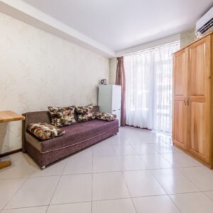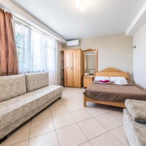 Семейный номер с двуспальной кроватью и раскладывающимся диваном. Балкон с видом на море или на сад.В номере