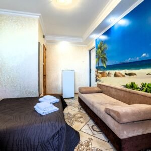 Семейный номер с двуспальной кроватью и раскладывающимся диваном. Балкон с видом на море или с видом на горы и сад.В номере