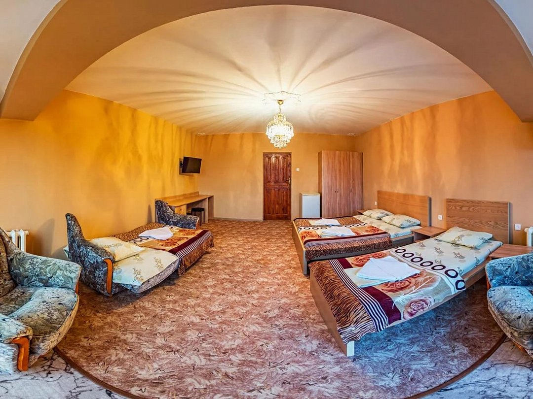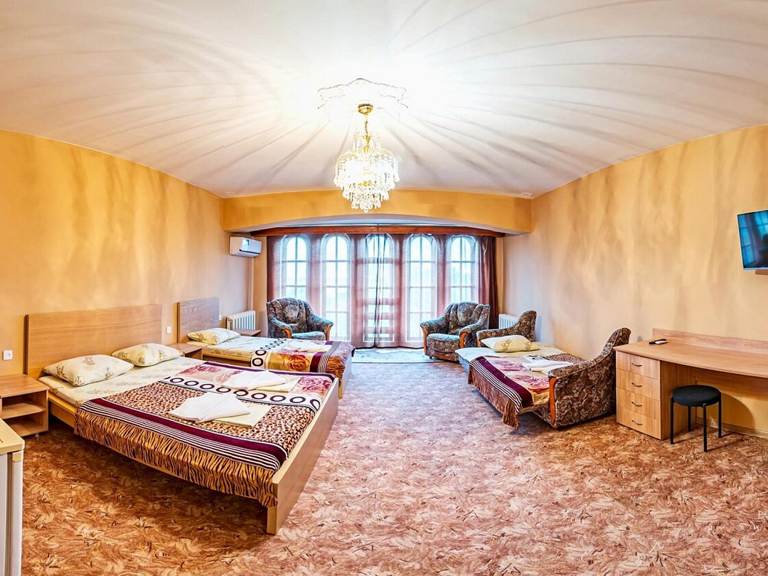 Номер предназначен для проживания 4-5 человек. В комнате есть две двухспальные кровати и диван-кровать. Этот вариант идеально подходит для 4-5 гостей. В номере также имеется все необходимое для комфортного отдыха и приятного времяпрепровождения. На каждом этаже кулер с горячей и холодной водой.В номере