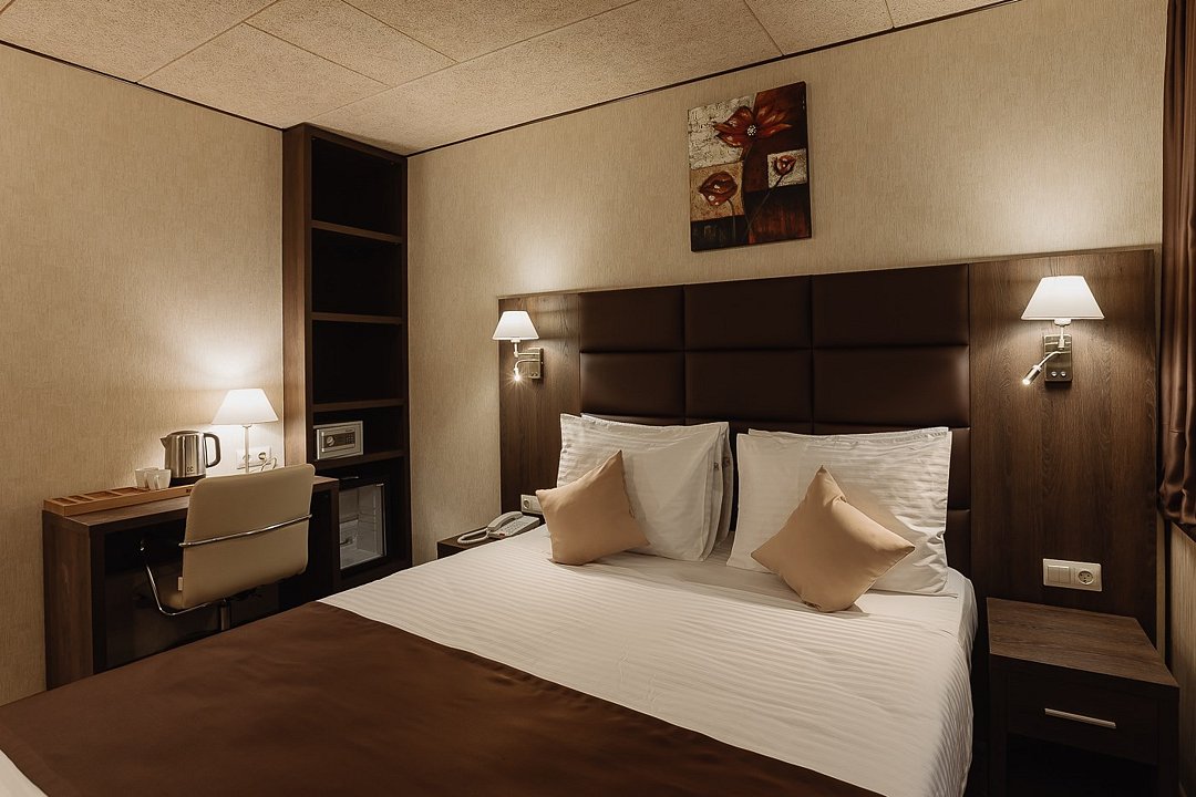 телевизор, Wi-Fi, интернет, телефон, холодильник, кондиционер, светильник, настольные лампы, фен, электронные замки, душевая кабина, ванна или душевая кабина, санузел, халаты, банные полотенца, косметические средства, кровать «King size», стулья, письменный стол, звуконепроницаемые стены и окна, мини-бар, чайный набор, обслуживание номеров, информационная карта, меню, сейф, минеральная вода, чайник, унитаз, раковина, питьевая вода, отопление, душ, вид на сад, вид на город, кулер на этаже, вид во двор, ламинат, стаканы, стул, стол, тумба, туалетные средства, туалет, вид на парк, цифровое тв, внутренний телефон, телевизор с плоским экраном, мини-холодильник, москитная сетка, гостиничная парфюмерияВ номере