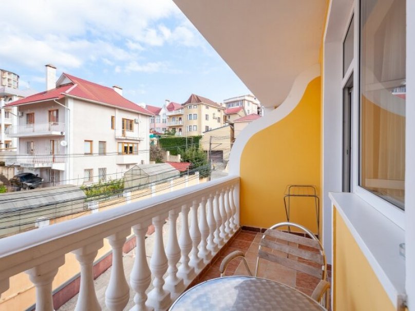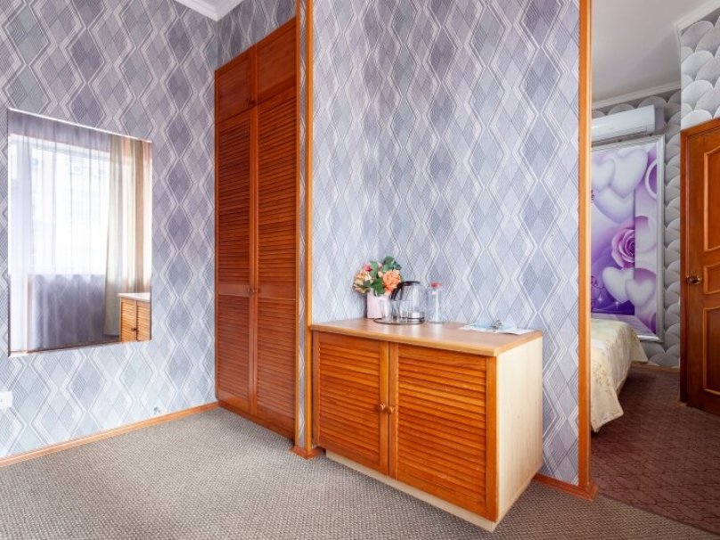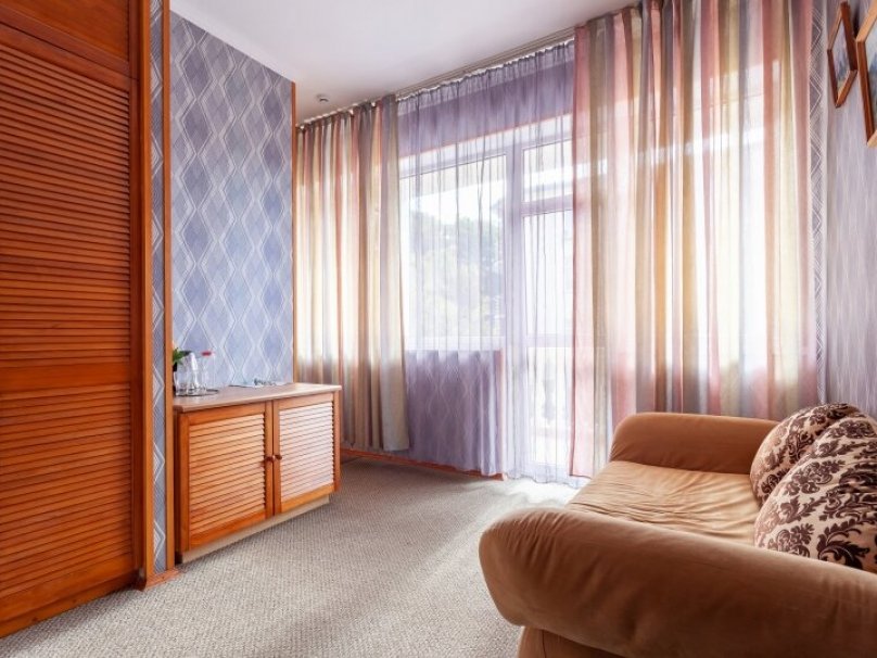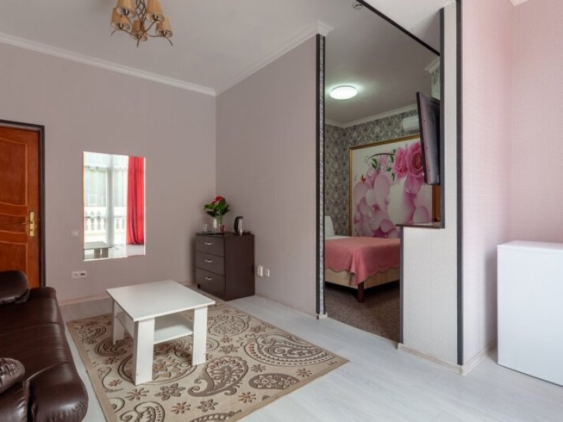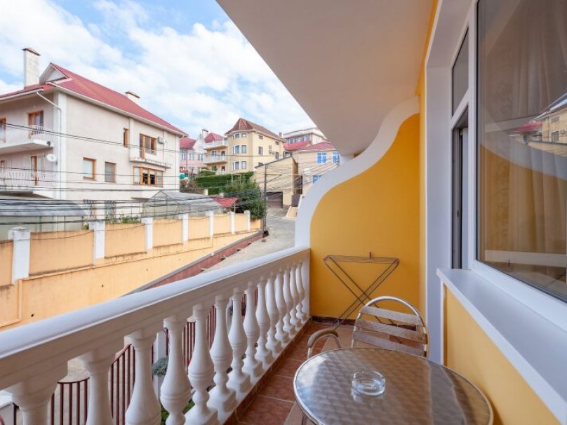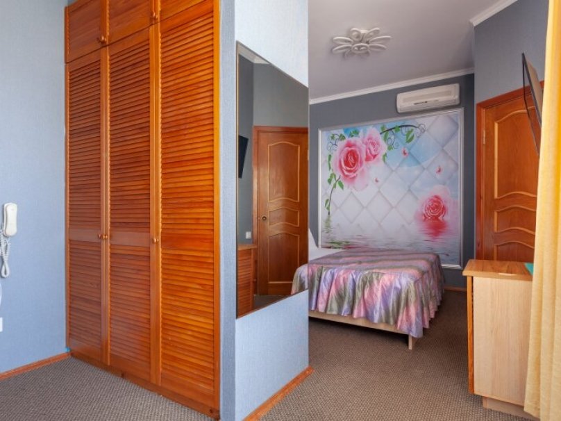 Двухкомнатный двухместный номер прихожей. Рассчитан на 2-х человек (с двуспальной кроватью) Санузел оборудован ванной, биде. На каждого гостя предусмотрен комплект из 3х полотенец разного вида . В номере имеется телевизор (10 центральных каналов), холодильник (по желанию заполняемый мини-баром), кондиционер, телефон ( внутренняя, городская связи), торшер.С номера есть доступ на открытый балкон(терраса), на балконе имеется каркасная мебель, лежаки для загара (стол, стулья). Номер оборудован электронной системой контроля доступа «Salto»исание номера данной категории ...В номере