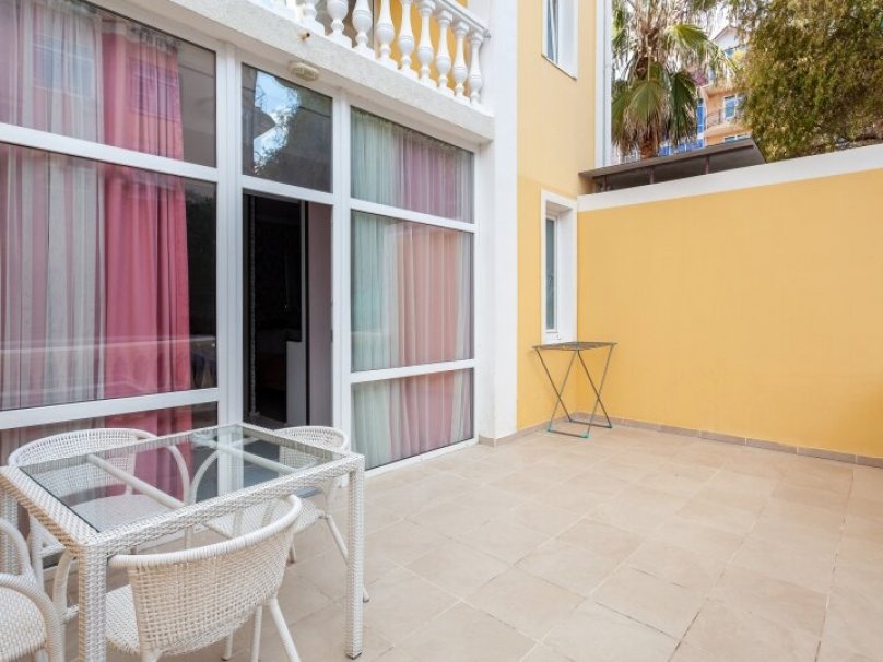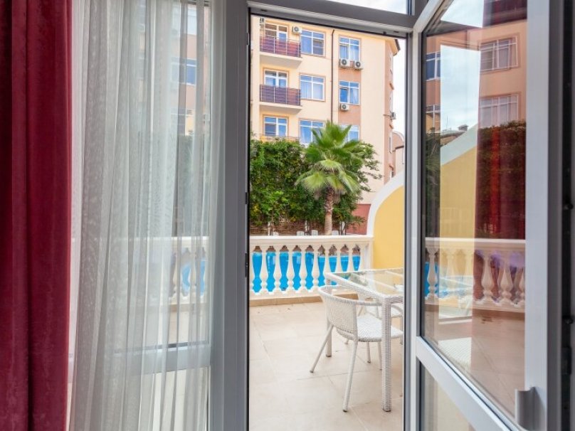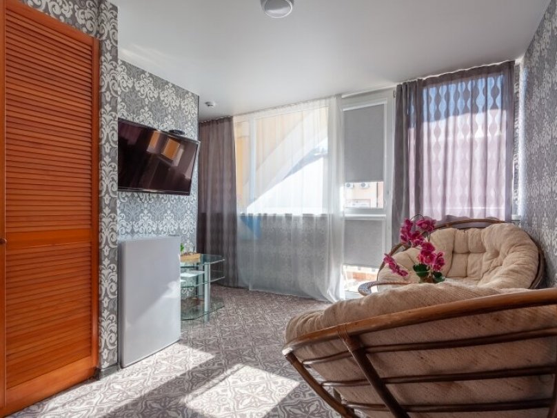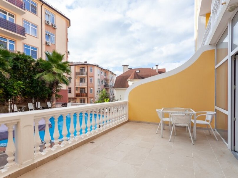 Общая площадь номера 24м2. Двухкомнатный двухместный номер с террасой. Рассчитан на 2-х человек (с двуспальной (французской) кроватью), номер оборудован дополнительными местами - раскладной диван (выдается третий комплект белья на дополнительное место.) Санузел оборудован ванной, биде, раковиной и фен. На каждого гостя предусмотрен комплект из 3х полотенец разного вида . В номере имеется телевизор (20 центральных каналов), холодильник (по желанию заполняемый мини-баром), кондиционер, телефон ( внутренняя связь), бра. В номере есть терраса с видом на бассейн с шезлонгами, столик. Номер оборудован электронной системой контроля доступа «Salto».В номере