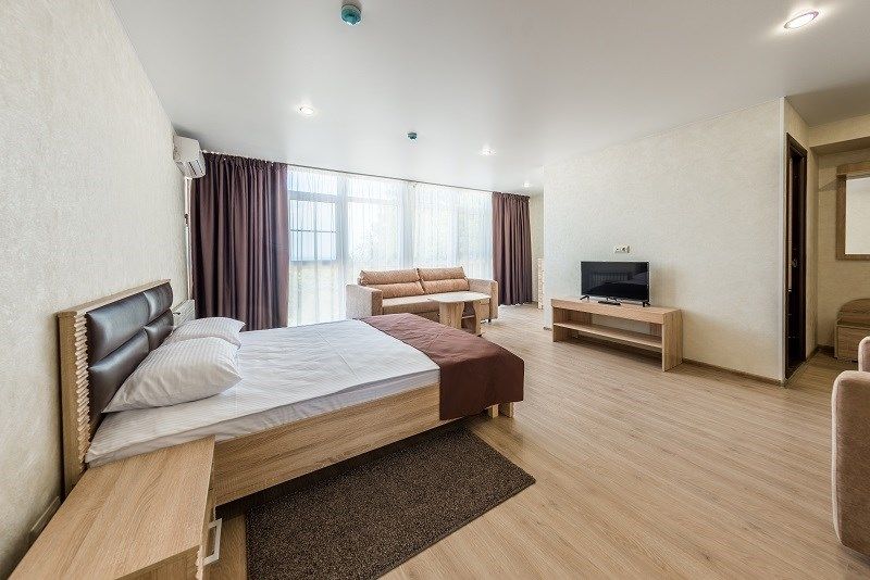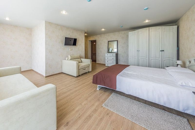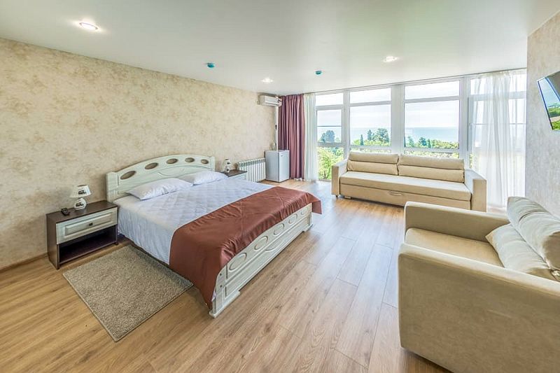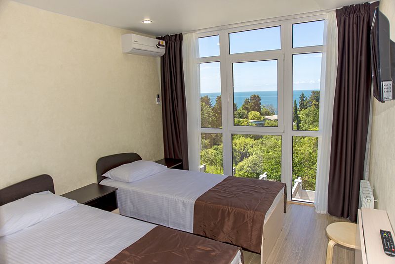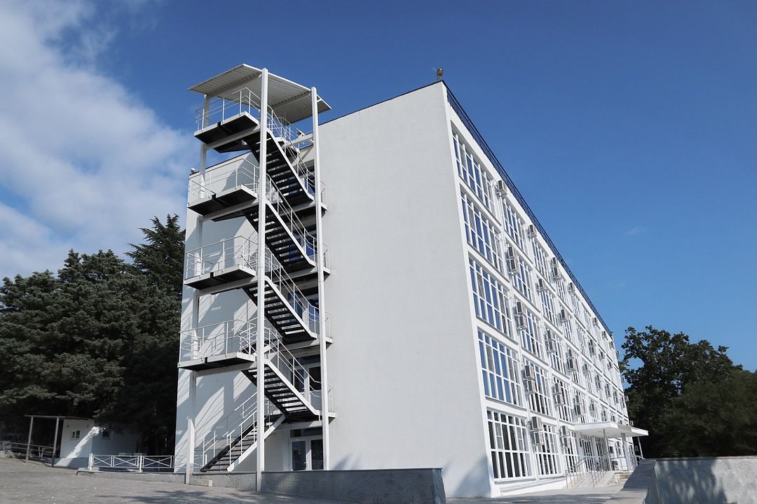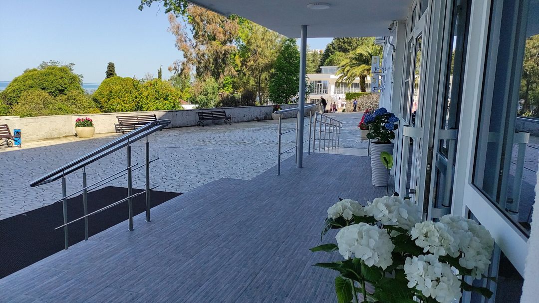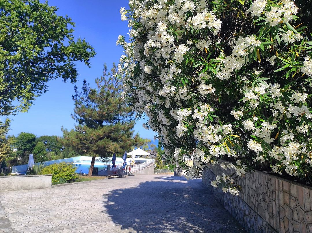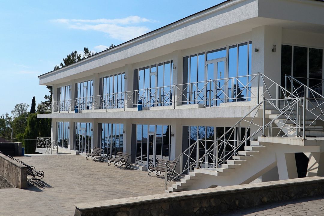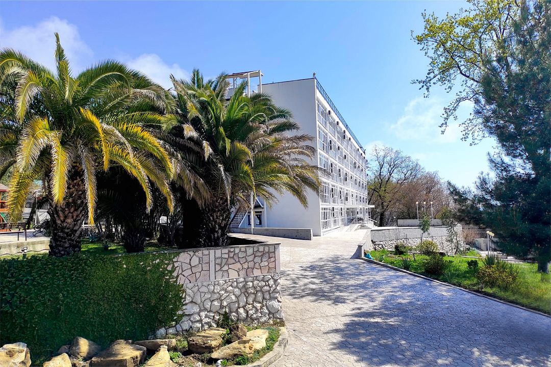 Роскошное здание белоснежного цвета состоит из пяти этажей. В нем много окон панорамного типа. Из них так прекрасно любоваться чудесными морскими пейзажами. В пансионате 115 номеров. Они стильно меблированы и оборудованы в строгом соответствии с современными требованиями. В каждом номере есть санузел и душ, холодильник, беспроводный интернет, телевизор и кондиционер.