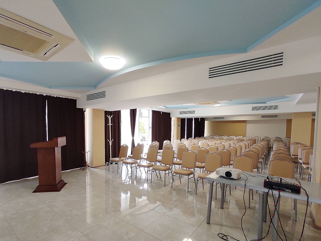 Благодаря обилию дневного света из огромных панорамных окон, выходящих в парк, нескольким входам, а также классическому дизайну просторный конференц-зал «Бирюзовый» является отличным местом для проведения деловых мероприятий до 130 человек.