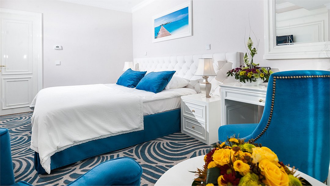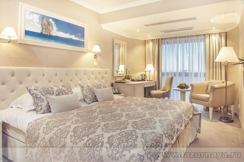 Цены включают: проживание, завтрак, посещение Спа центра и пляжа, НДС. «Джуниор сюит» - cтильный однокомнатный номер площадью 40 кв.м с ванной комнатой. Максимальное размещение гостей в номере 2 взрослых + 2 ребенка до 17 лет (включительно) Третий взрослый может размещаться только в отдельном номере. Для детей до 3х лет предоставляются бесплатно детские кроватки 120 см (по запросу). Номера расположены на 1 и 2 этажах и 17-18 этажах. Бронирование для сотрудников ПАО "Газпром" и дочерних обществ по специальным тарифам (Путевкам с 3-ех разовым питанием ) производится только по телефону (+ 7 8622 66 30 00 ) или эл. почте (res@lazurnaya.ru) отдела бронированияУслуги и удобства