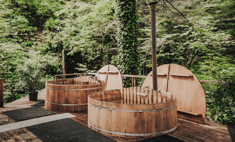 Погрузитесь в традиции Востока. Две кедровых бочки фурако на открытом воздухе с горячей водой, с добавлением ароматических масел и настоев трав предназначены для снятия стресса и избавления от усталости.
