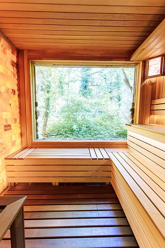 Влажная Альпийская сауна. Панорамное окно на вид реликтового леса, стена из гималайской соли и ароматные травы на полках.