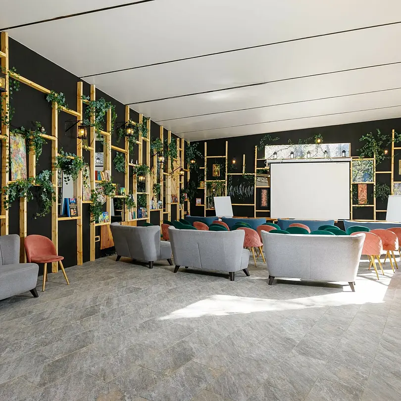 Интерьер зала выполнен в современном стиле и сочетает в себе простоту линий с продуманной архитектурой. Зал имеет возможность разной застройки в зависимости от формата мероприятия.