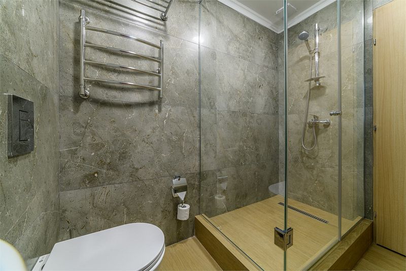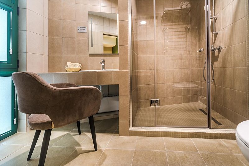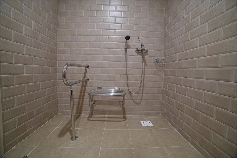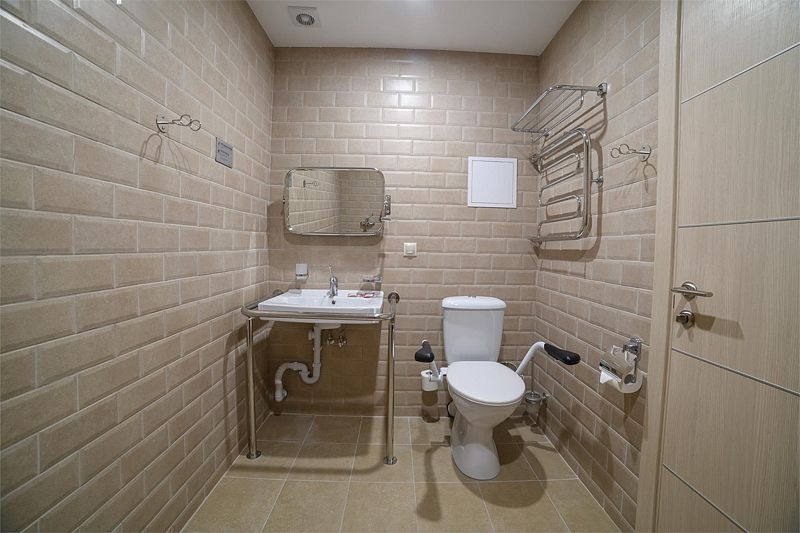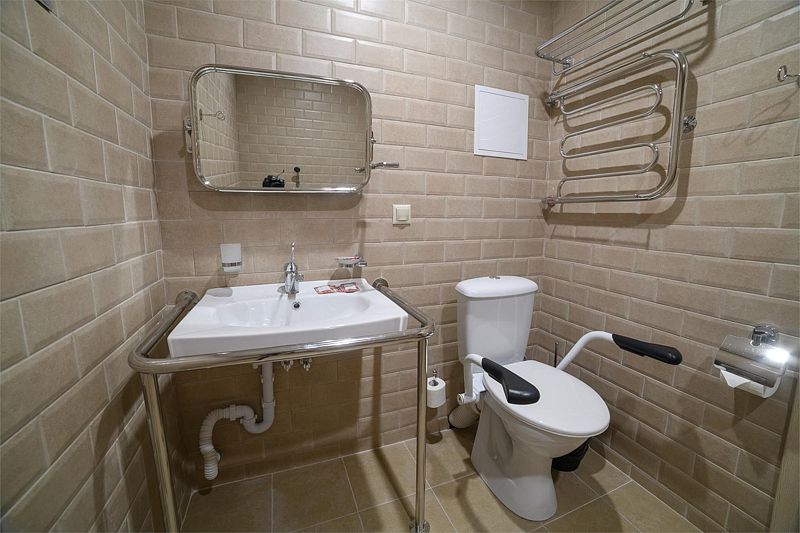 Санузел оснащен: специализированной душевой кабиной, умывальником, унитазом оборудован поручнем, зеркалом с подсветкой, феном.