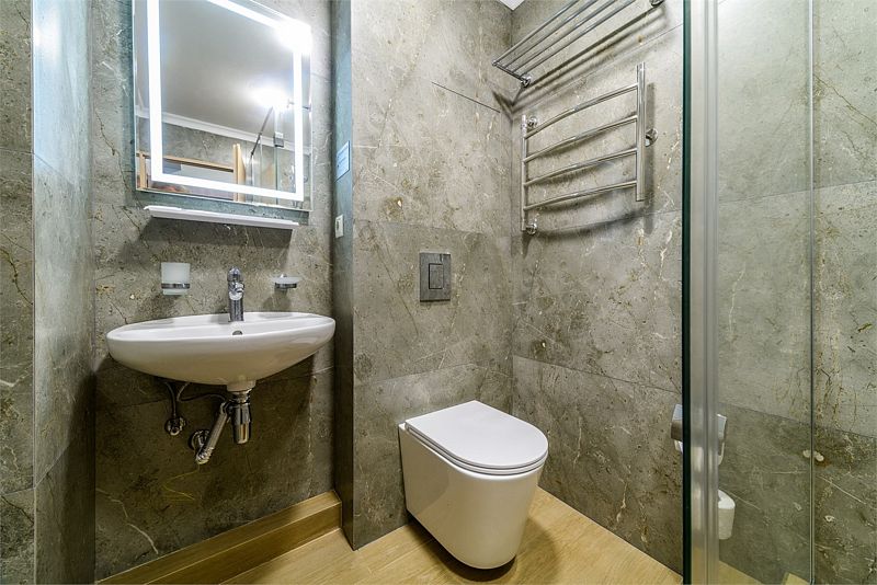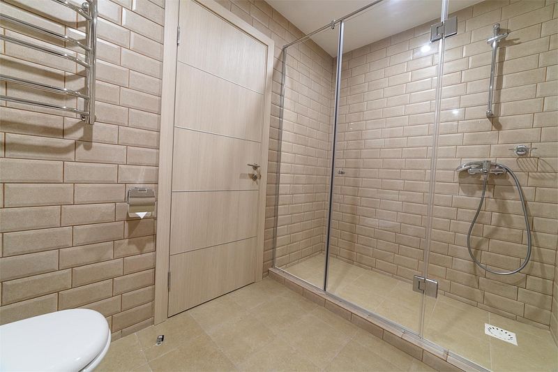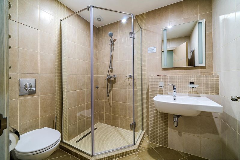 Санузел оснащен душевой кабиной, умывальником, унитазом, зеркалом с подсветкой, феном.