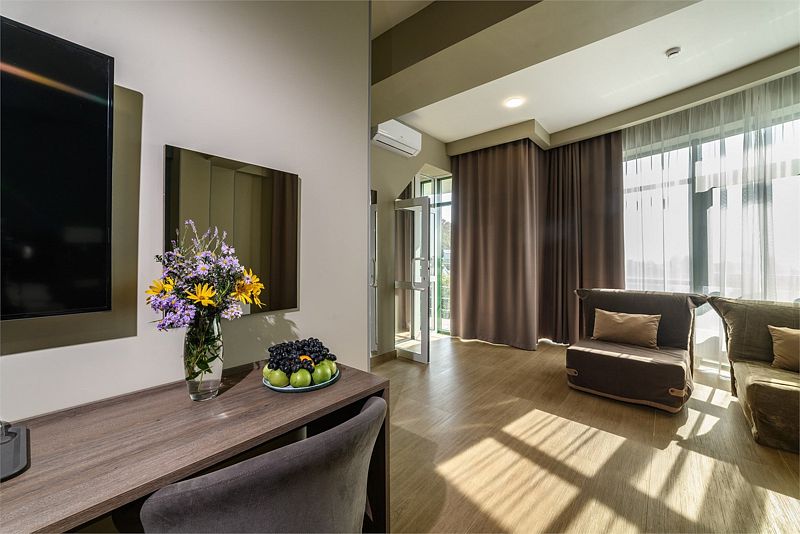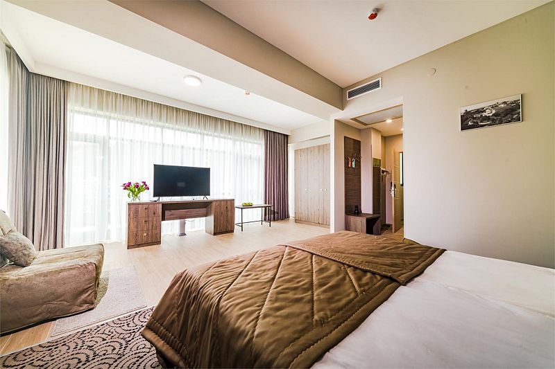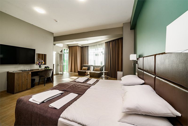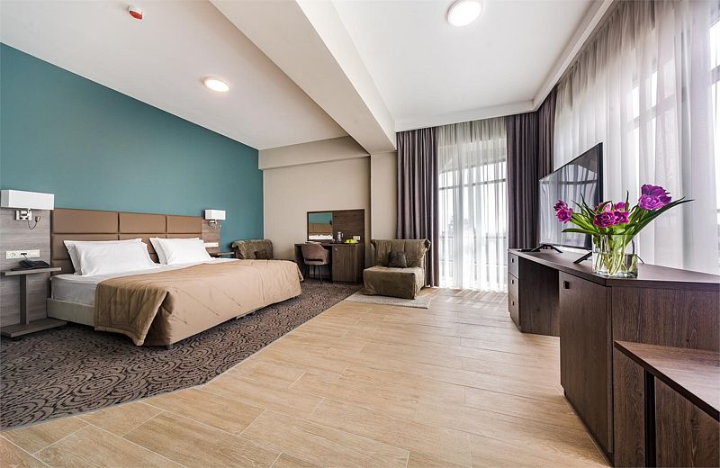Для проживания гостей комплекс предоставляет 115 уютных номеров, которые располагают к полноценному отдыху. К услугам отдыхающих Спортивный Центр, велнес и фитнес программы, спа–центр с пятью видами бань, центр красоты, рестораны и бары, конгрессные услуги и детский центр.