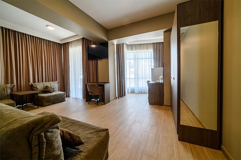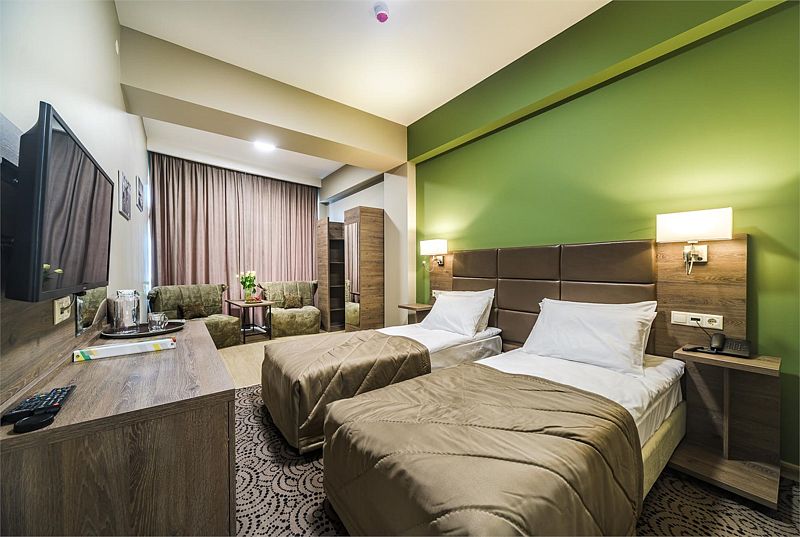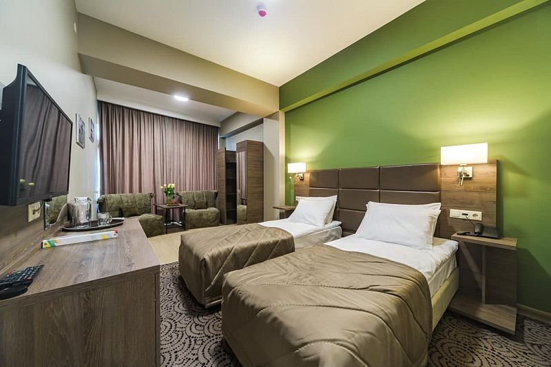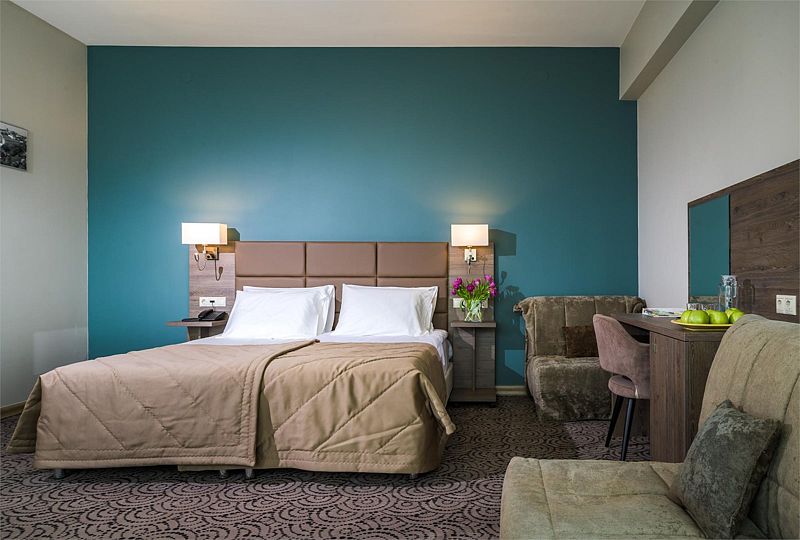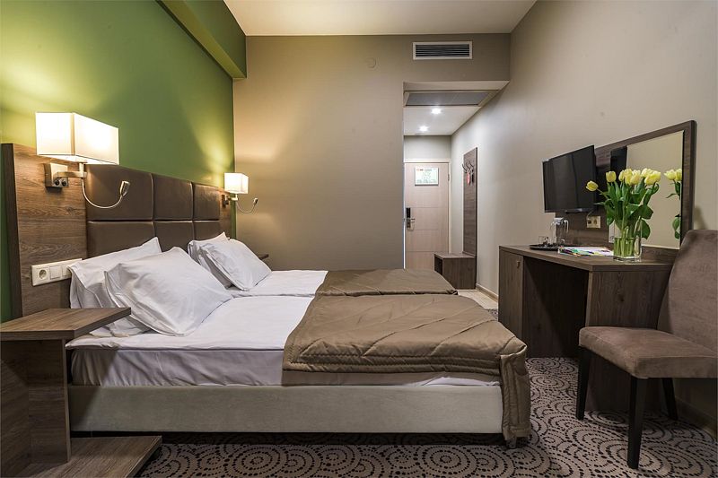 Номер состоит из одной комнаты, санузла, прихожей. В номере имеются 2 кровати, 0/1/2 кресло-кровать стул, стол туалетный с зеркалом, набор посуды (графин и две чашки), 2 прикроватных тумбочки, 2 прикроватных бра, телевизор, холодильник, телефон, сейф, шкаф.