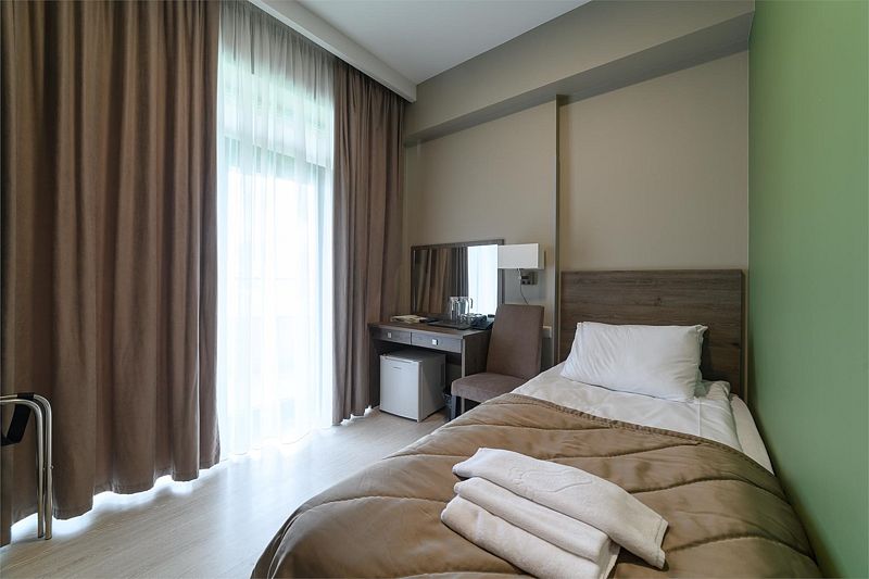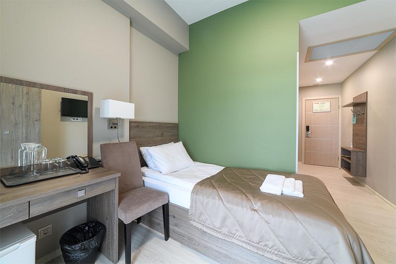 В номере имеются 1 кровать, стул, стол туалетный с зеркалом, набор посуды (графин и две чашки), 1 прикроватная тумбочка, 1 прикроватное бра, телевизор, холодильник, телефон, сейф, шкаф. Санузел оснащен душевой кабиной, умывальником, унитазом, зеркалом с подсветкой, феном, сушилкой для белья.