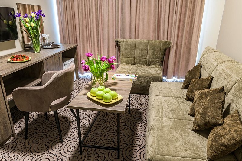 Номер состоит из одной комнаты, санузла, прихожей. В номере имеются 2 кровати, кресло-кровать, стул, 2 стола журнальный, туалетный с зеркалом набор посуды (графин и чашки), 2 прикроватные тумбочки, 2 прикроватные бра, телевизор, холодильник, телефон, сейф, шкаф.