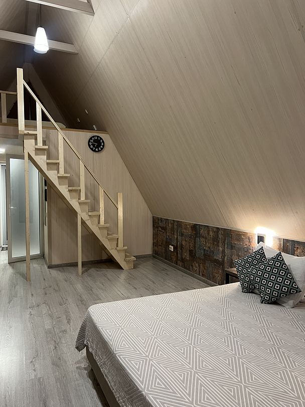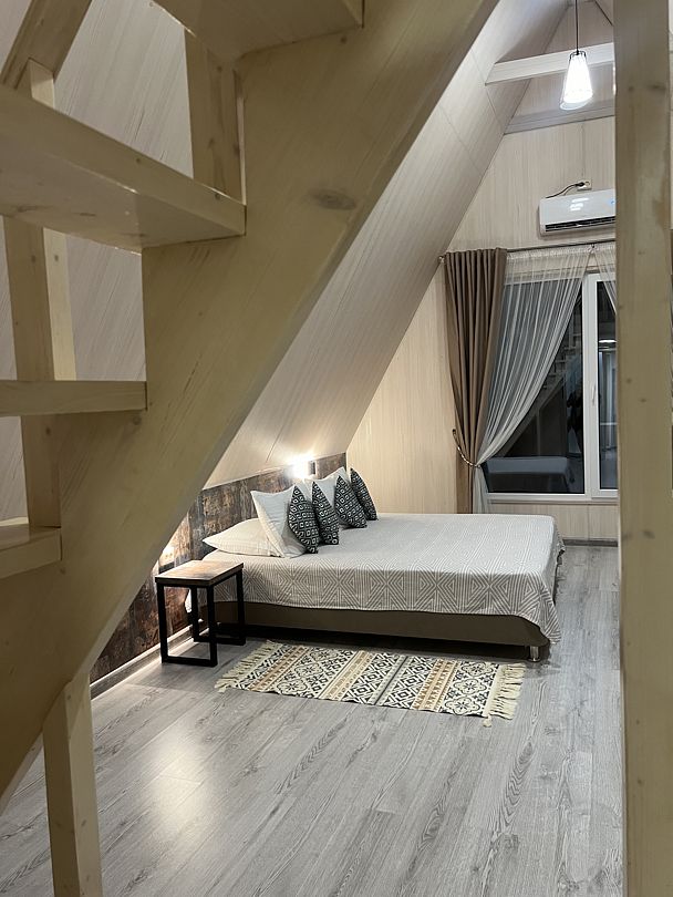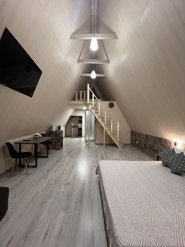 Погрузитесь в атмосферу уюта и современного стиля в номере A-frame, где каждый уголок создан для вашего комфорта. Просторное и светлое помещение с высокими потолками дарит ощущение свободы, а панорамные окна открывают захватывающий вид. Здесь вы сможете просыпаться под звуки природы и наслаждаться утренним солнцем, отражающимся в спокойных водах.