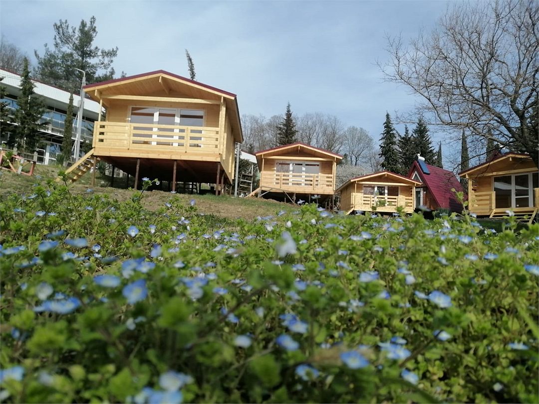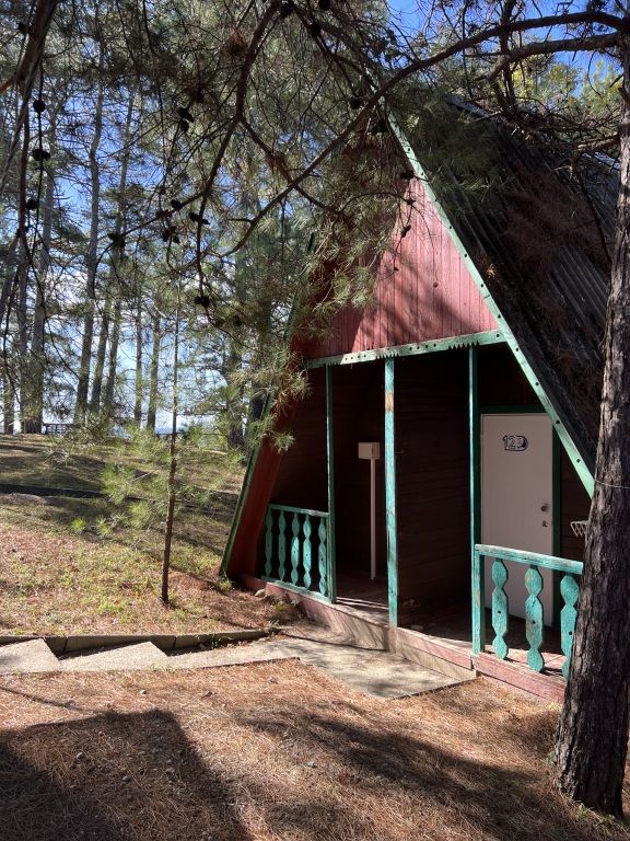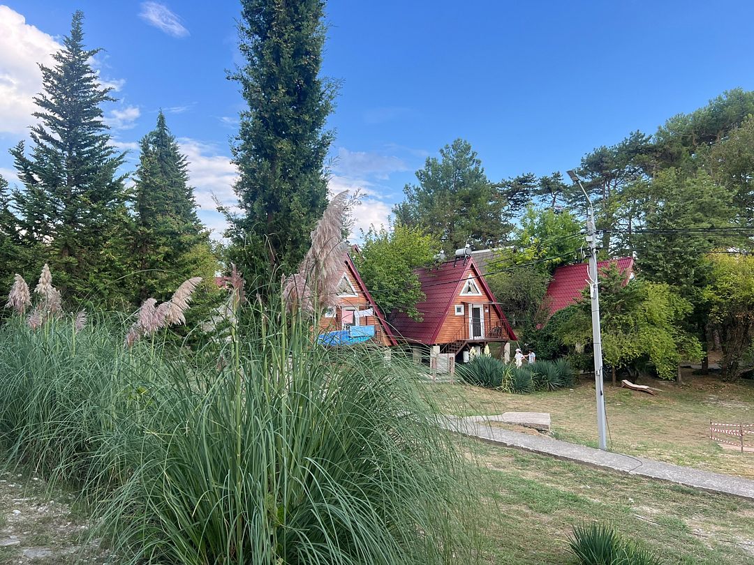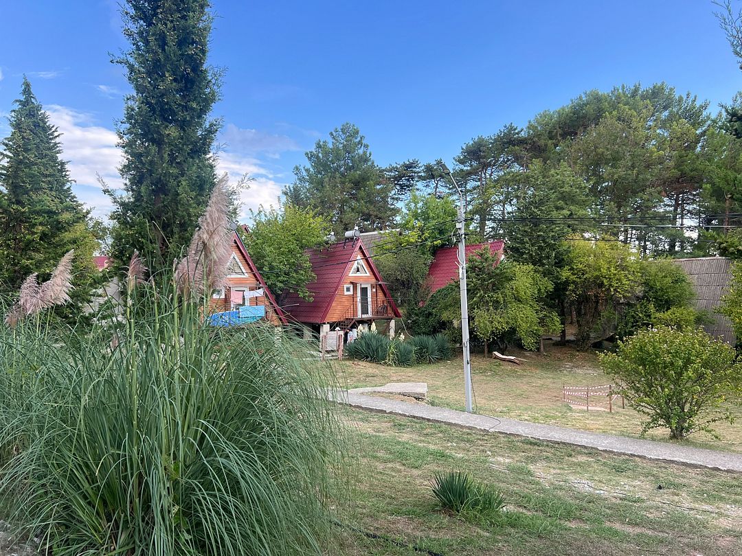 Закрытая территория базы в 2 гектара предлагает своим гостям уютные домики в стиле типа А-фрейм, номера в двухэтажной гостинице, близость к пляжу, детскую игровую площадка и качели среди сосен, где юные гости и их родители смогут наслаждаться природой в любое время года.