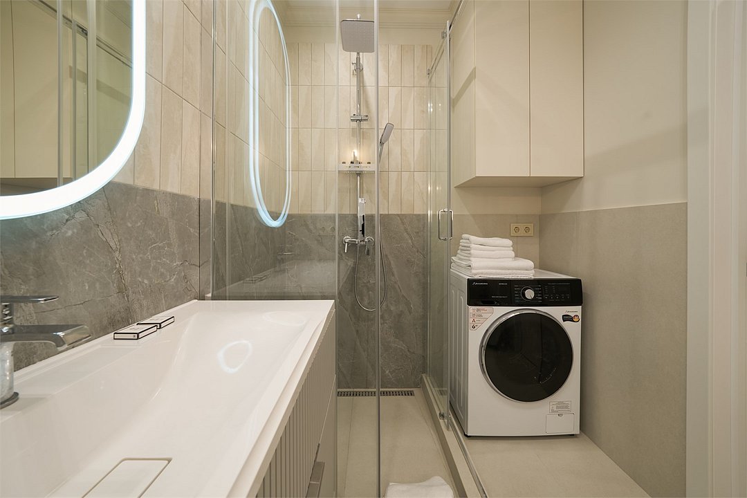 телевизор, Wi-Fi, кондиционер, система климат-контроля, светильник, фен, система безопасности, электронные замки, плита для приготовления пищи, утюг, ванная комната, теплый пол, халаты, банные полотенца, пляжные полотенца, тапочки, косметические средства, балкон, двуспальная кровать, гипоаллергенное белье, гладильная доска, стулья, вешалки, зеркало, мебельный гарнитур, кухня, чайный набор, набор посуды, стиральная машина, чайник, раковина, косметическое зеркало, питьевая вода, душ, плиточное покрытие, вид во двор, ламинат, кухонная посуда, стаканы, столовые приборы, туалетный столик, сушилка для белья, вид на горы, телевизор со Smart TV, теплые полы, номер для некурящих, пуфик, онлайн-регистрация до заезда, уборка номера, услуги прачечной (платно), мыло, зеркало в полный рост, коворкинг, прачечная (за дополнительную плату), комната для переговоров (за дополнительную плату), можно с питомцами, Android TVВ апартаментах