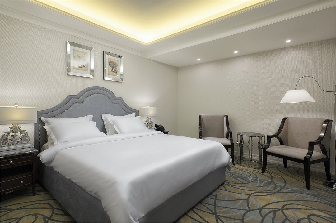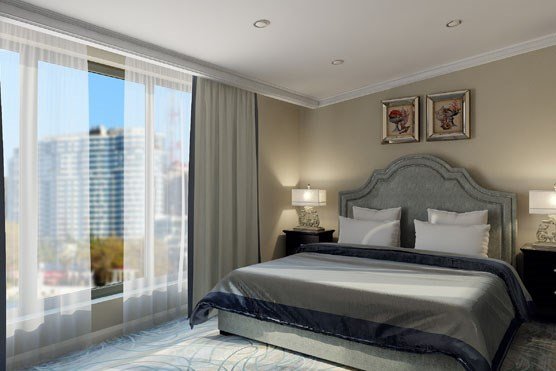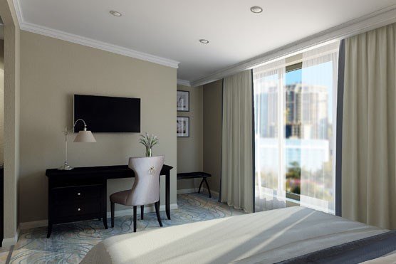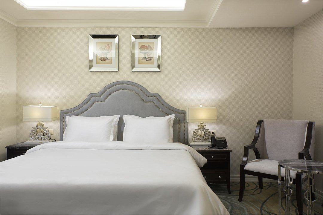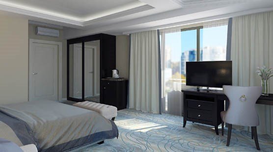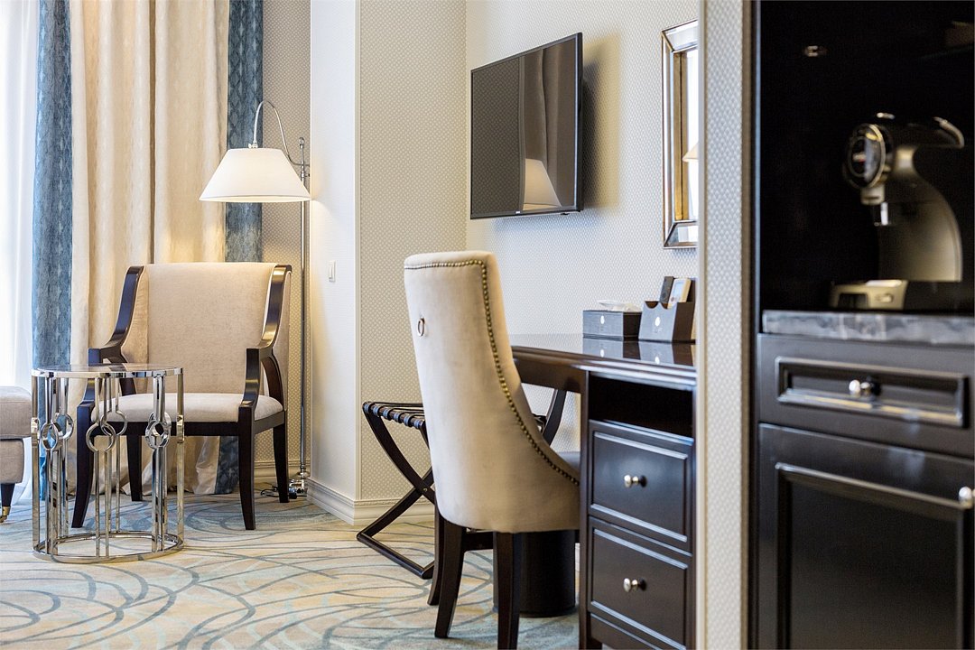 телевизор, спутниковое телевидение, Wi-Fi, телефон, холодильник, кондиционер, система климат-контроля, светильник, настольные лампы, фен, электронные замки, кофемашина, санузел, банные принадлежности, халаты, банные полотенца, пляжные полотенца, тапочки, гигиенические средства, косметические средства, кровать «Queen size», тумбы, стулья, шкаф для одежды, гардеробная, вешалки, письменный стол, багажная тумба, зеркало, комод, эксклюзивная мебель, мини-бар, чайный набор, набор посуды, обслуживание номеров, сейф, унитаз, раковина, мягкая мебель, питьевая вода, ковровое покрытие, отопление, душ, вид на город, кресло, кухонная посуда, стаканы, столовые приборы, кофейный столикВ гостиничном номере