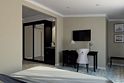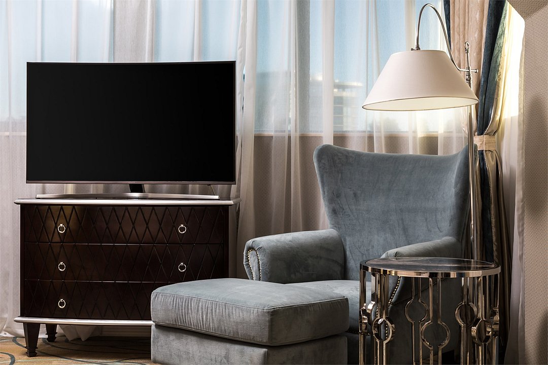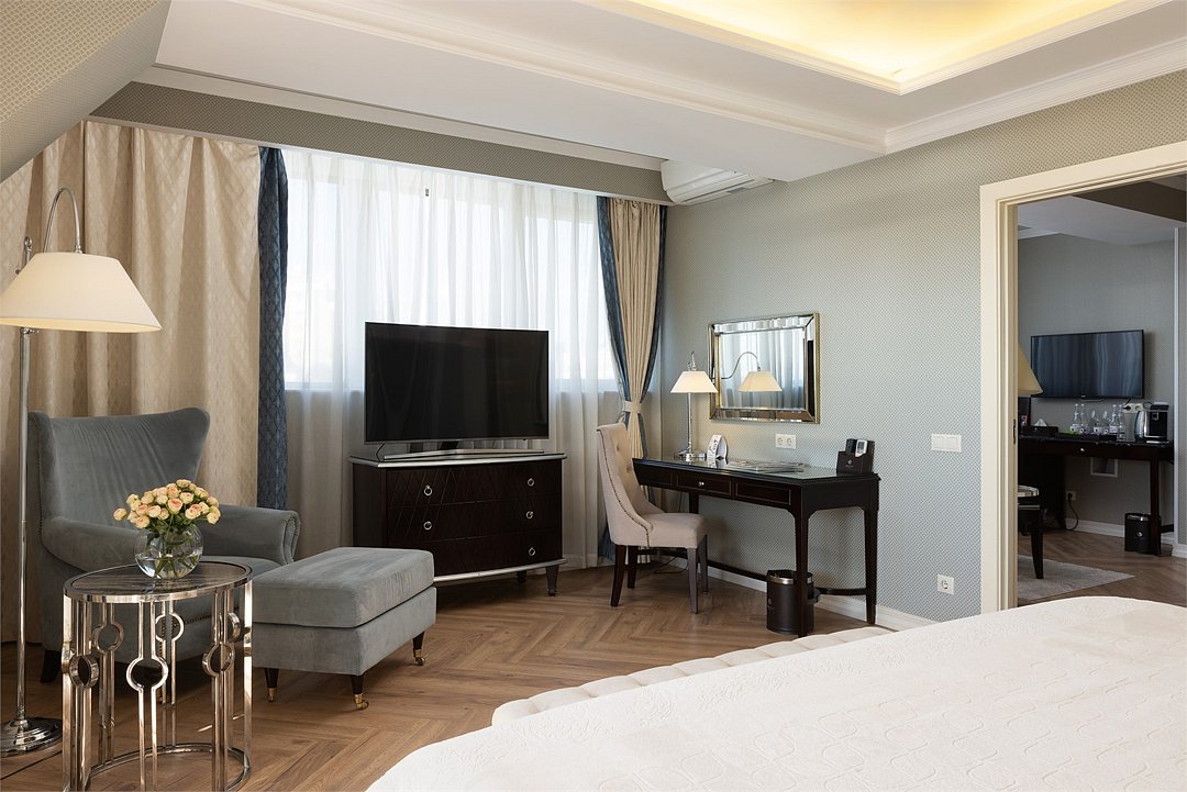 два телевизора, спутниковое телевидение, Wi-Fi, телефон, холодильник, кондиционер, система климат-контроля, светильник, настольные лампы, фен, электронные замки, кофемашина, ванна, санузел, халаты, банные полотенца, пляжные полотенца, тапочки, гигиенические средства, косметические средства, кровать «Queen size», диван, кресла, тумбы, стулья, шкаф для одежды, гардеробная, вешалки, журнальный столик, письменный стол, багажная тумба, комод, пуфики, эксклюзивная мебель, мини-бар, чайный набор, набор посуды, обслуживание номеров, сейф, унитаз, раковина, мягкая мебель, питьевая вода, обеденная зона, гостиная зона, ковровое покрытие, душ, вид на сад, вид на город, кресло, стаканы, столовые приборы, кофейный столик, вид на паркВ гостиничном номере