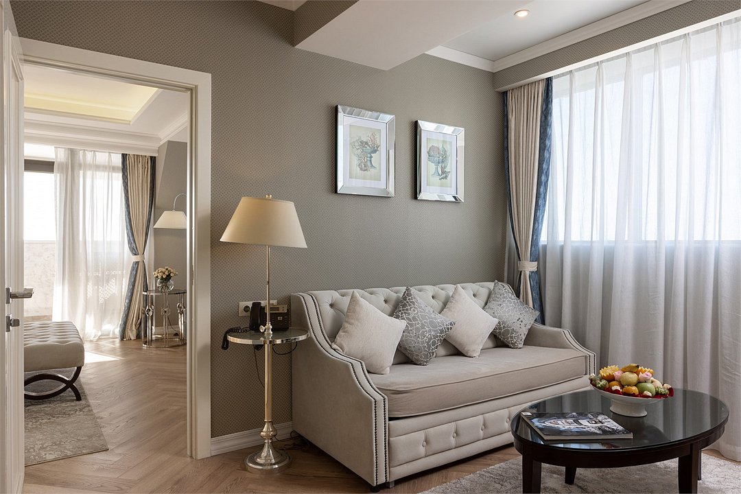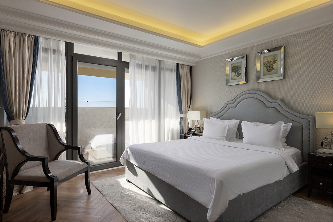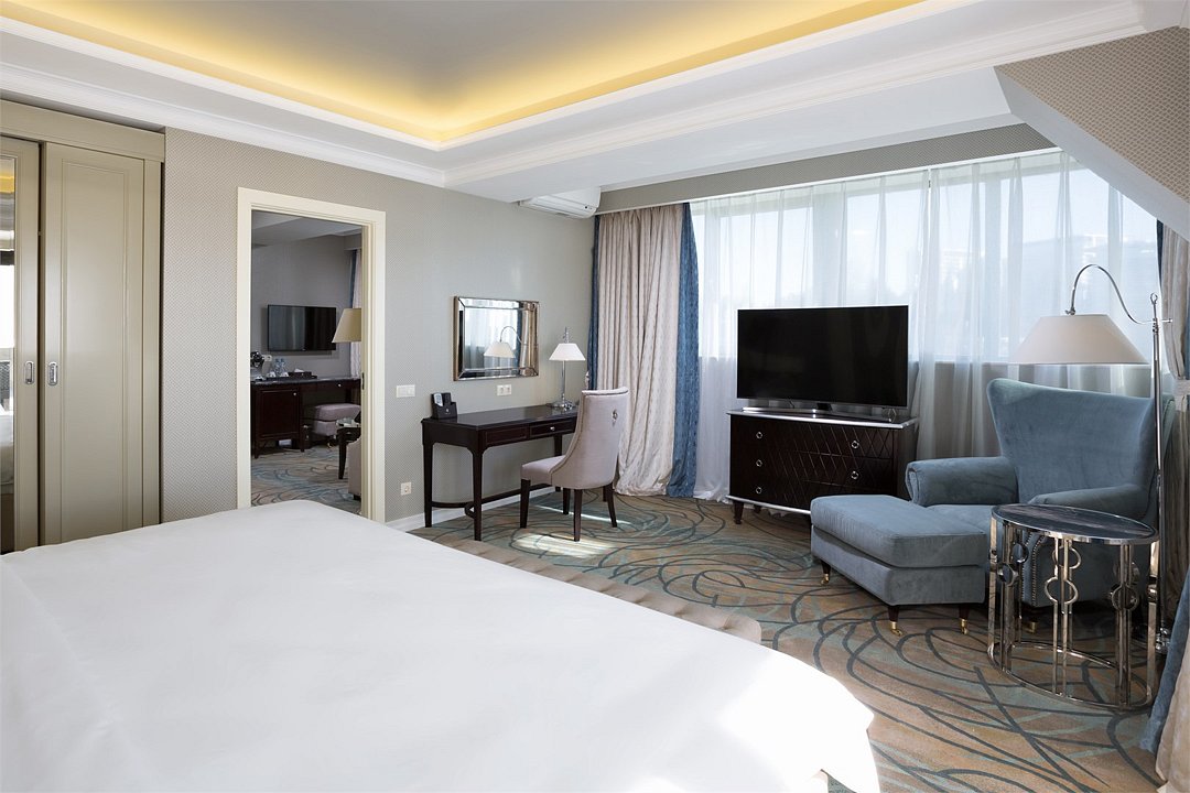 два телевизора, спутниковое телевидение, Wi-Fi, телефон, холодильник, кондиционер, система климат-контроля, светильник, настольные лампы, фен, электронные замки, кофемашина, гидромассажная ванна, санузел, биде, банные принадлежности, халаты, банные полотенца, пляжные полотенца, тапочки, гигиенические средства, косметические средства, балкон, балкон с красивым видом, кровать «King size», диван, кресла, тумбы, стулья, шкаф для одежды, гардеробная, вешалки, журнальный столик, письменный стол, обеденный стол, багажная тумба, зеркало, комод, пуфики, эксклюзивная мебель, мебельный гарнитур, две комнаты, мини-бар, чайный набор, набор посуды, обслуживание номеров, сейф, унитаз, раковина, мягкая мебель, косметическое зеркало, питьевая вода, обеденная зона, гостиная зона, ковровое покрытие, отопление, душ, вид на море, кресло, стаканы, столовые приборы, туалетный столик, кофейный столикВ гостиничном номере