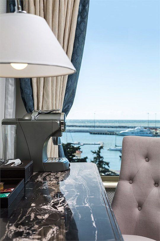 Номер с кроватью "queen-size" и видом на Морской порт Сочи. В числе удобств — терраса с гидромассажный ванной и садовой мебелью, гостиная с телевизором с плоским экраном, рабочий стол, кондиционер, электрический чайник, мини-бар, кофемашина Nespresso и принадлежности для приготовления чая/кофе. В данной категории номера гостям отеля предоставляется премиальная британская косметика бренда «The White Company», являющаяся синонимом идеальной простоты, повседневной роскоши и безупречного качества. Лучшая коллекция элегантных и восстанавливающих ароматов для тела в отеле «Marina Yacht by Stellar Hotels, Sochi». Собственная ванная комната с тропическим душем укомплектована туалетно-косметическими принадлежностями, полотенцами, халатами и тапочками.Услуги и удобства