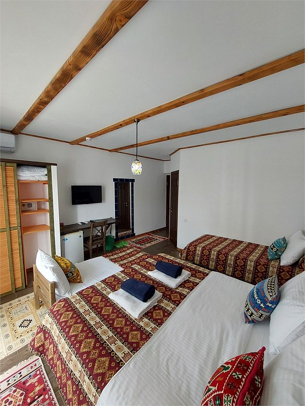 О, странник, склонись же в поклоне пред вратами восточной сказки! Дай сердцу своему распахнуться навстречу чарующим грезам! Вообрази же: не просто покои, а палаты достойные самого султана, где для тебя приготовлены два отдельных ложа, словно два мира, каждый из коих дарует свой собственный сон, исполненный покоя и безмятежности. После долгих странствий, полных дивных приключений и захватывающих дух открытий, свежесть прохладного источника смоет усталость с чела твоего, а нежность шелковых полотенец, сотканных руками искуснейших мастериц, и благоухание, достойное самих падишахов, укутают тебя негой, словно дымка ароматного кальяна, уносящая в мир фантазий. Ибо здесь, вся роскошь мира – у твоих ног: прохлада, спасающая от зноя пустыни, словно оазис спасения в знойный день, услада для горла в виде прохладительных напитков, дарующих бодрость и свежесть, завораживающие видения на экране, словно страницы восточных сказок, перелистывающиеся сами собой, а сокровища твои – под надежной охраной в сундуке-сейфе, хранящем тайны веков и оберегающем их от злых умыслов. Соверши же обряд омовения, ибо чистота – это половина веры, путь к духовному просветлению и гармонии! Каждые два дня, словно по велению джинна, сложенные стопкой, как снежные вершины гор, свежие полотенца явятся пред тобой, а заботливые руки, словно феи из волшебной истории, наведут порядок и уют в твоих покоях, дабы сон твой был тих и крепок, как шепот звезд в бархатной ночи, убаюкивающий путников в долгом путешествии. Окунись же в волшебные воды прохладного бассейна нашего, что искрится под ласковым солнцем, словно россыпь драгоценных камней, дарующих прохладу и исцеление! После – истома и нега в жаркой сауне, где расслабляются тело и дух, а затем – отведай чай дивный, благоухающий, по секретному рецепту приготовленный, передаваемому из поколения в поколение мудрыми целителями, с пирогами, тающими во рту, словно лунный свет в объятиях ночи, оставляющими после себя лишь сладкое послевкусие наслаждения. А наша трапеза… о ней слагают легенды, передавая из уст в уста, как сказания о великих героях и их подвигах! Ибо каждое блюдо – это целая поэма, сотворенная руками искусных поваров, словно великих поэтов, использующих щедрые дары специй и трав, собранных с самых дальних уголков земли, приправленных любовью и вдохновением. Кухня, дарующая силу и энергию тем, кто неустанно в пути, в чьих сердцах неугасимо пылает огонь жажды приключений, ищущих новые горизонты и стремящихся к неизведанному. Лишь четыре коротких мгновения отделяют тебя от ласковых волн моря, шепчущих древние сказания, а "Ласточка", словно ковер-самолет, домчит тебя к дивным чудесам Сочи за миг, словно по мановению волшебной палочки: к Морскому вокзалу, величественному Олимпийскому парку и заснеженным вершинам Красной Поляны, где ты сможешь ощутить себя властителем мира! Все сокровища мира – у твоих ног, о, странник, лишь протяни руку и возьми их! Позволь же нам окружить тебя заботой, достойной лишь властителей мира, ханов и эмиров, ибо ты – наш самый дорогой гость! Да пребудет с тобой мир, достаток и благодать, пока ты странствуешь по миру, и да хранят тебя духи предков на всех дорогах твоих!Услуги и удобства
