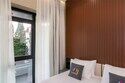 Уютный однокомнатный номер-студия на -1 этаже с панорамными окнами с живописным видом на сад на уровне 3го этажа (т.к.дом стоит на горе). С одной большой двуспальной или двумя односпальными кроватями с ортопедическими основаниями Botticelli и с кухонной зоной. Интерьер, выполненный в спокойных тонах, внесет безмятежность в ваш отдых.