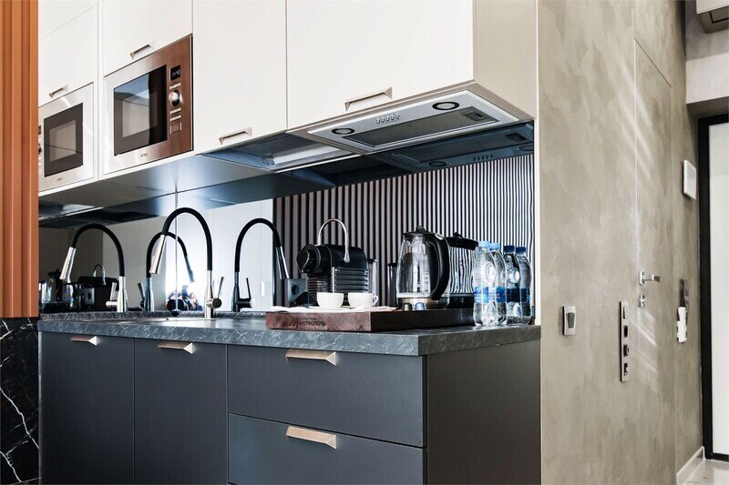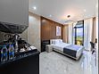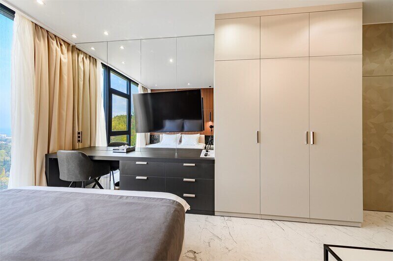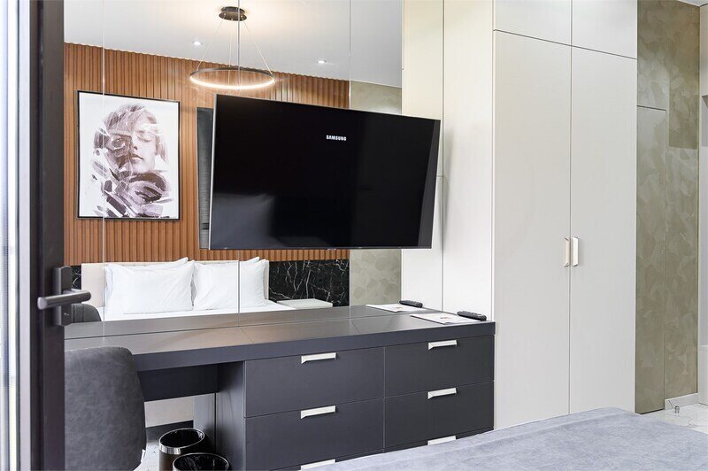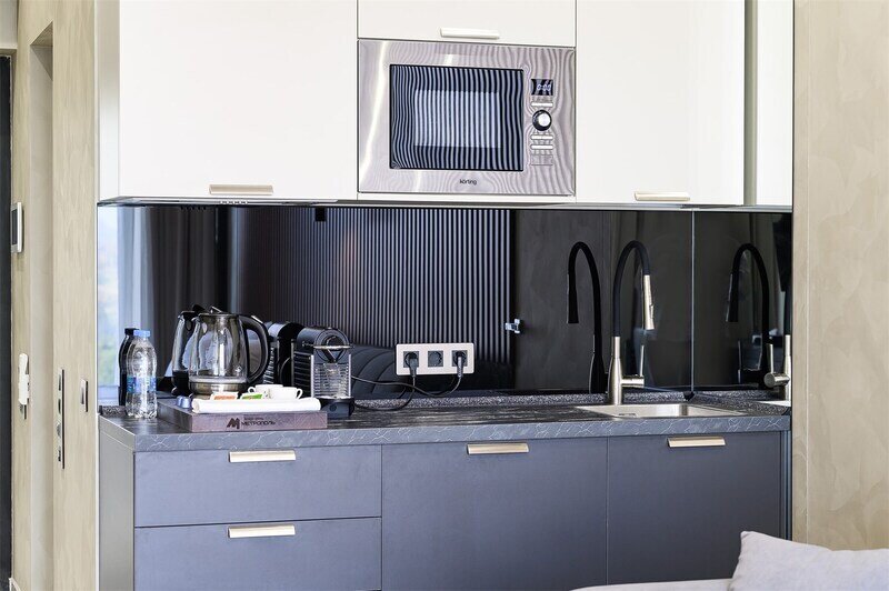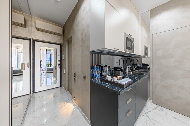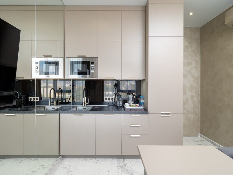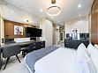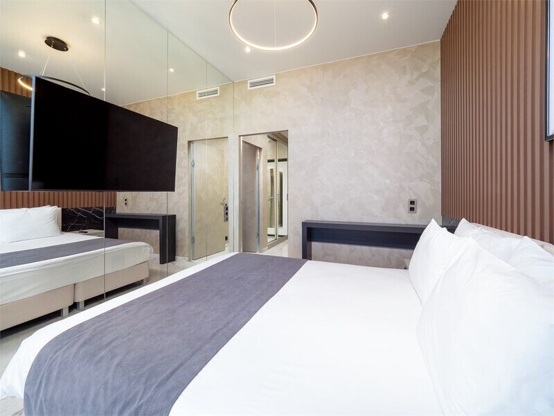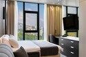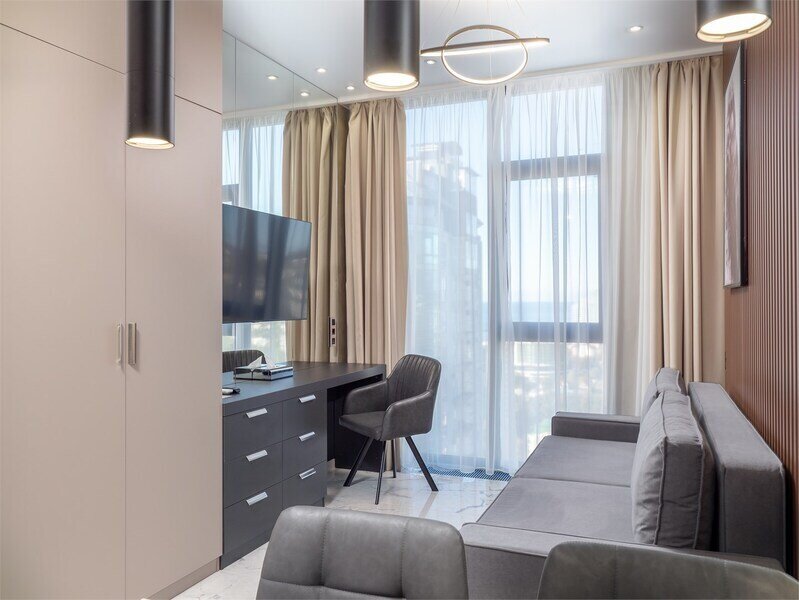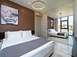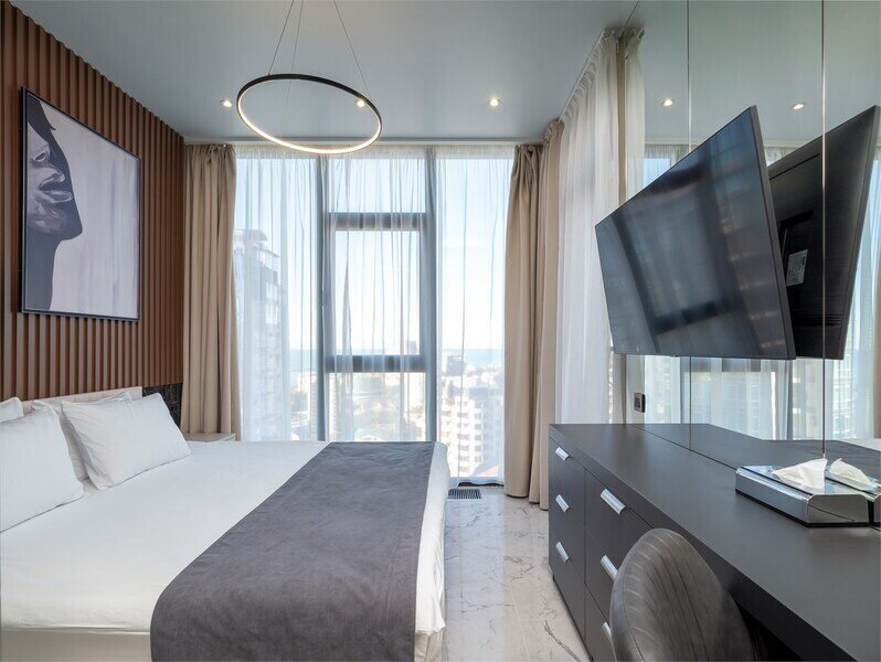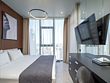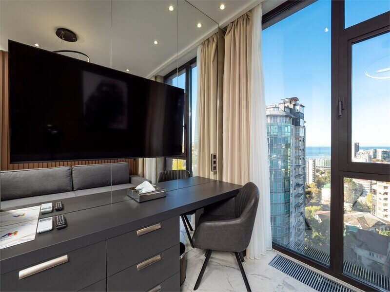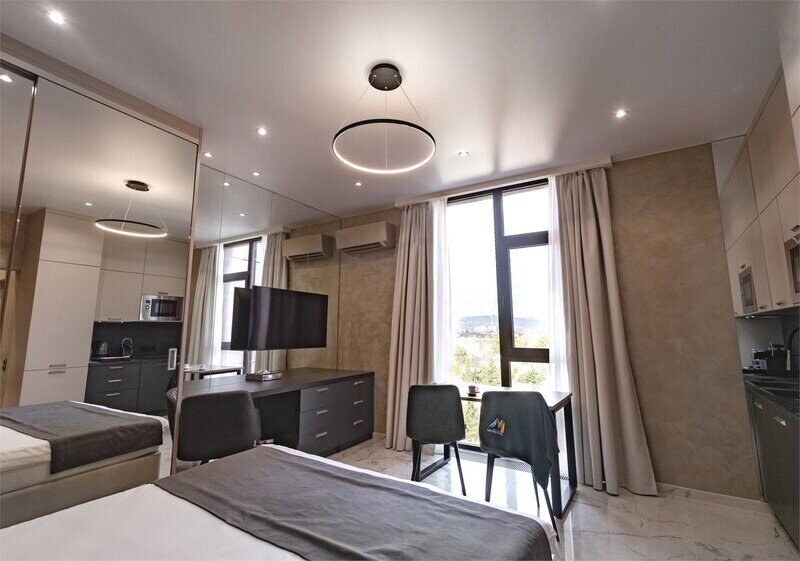 Уютный однокомнатный номер-студия с одной большой двуспальной или двумя односпальными кроватями с ортопедическими основаниями Botticelli и с кухонной зоной. Панорамные окна с живописным видом на город и море из всех окон данной категории. Интерьер, выполненный в спокойных тонах, внесет безмятежность в ваш отдых.