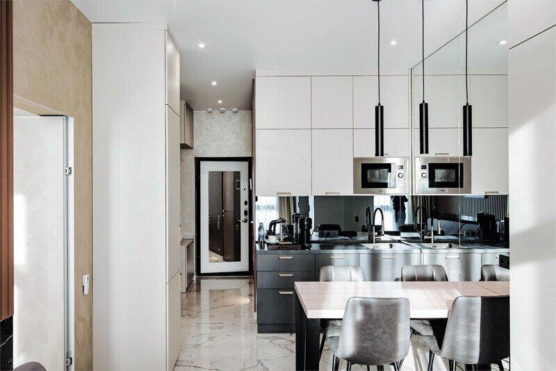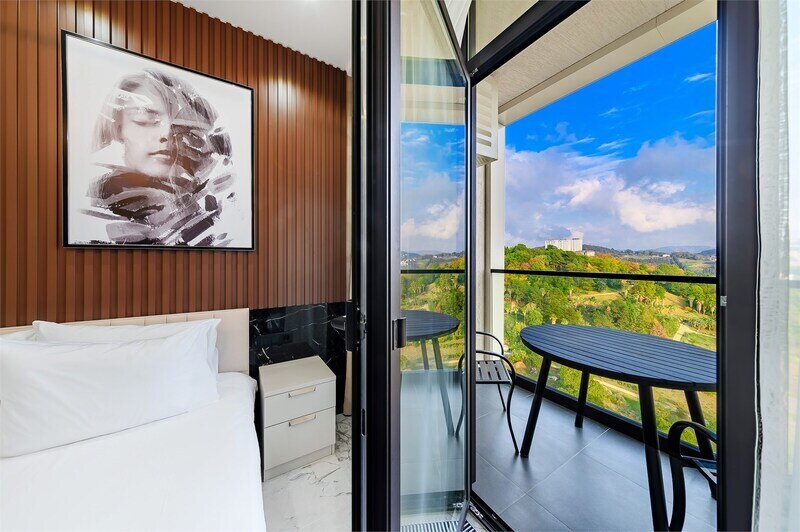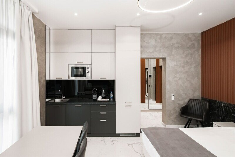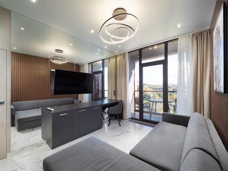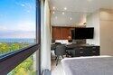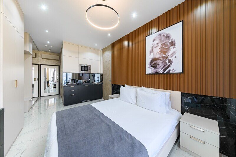 Уютный однокомнатный номер-студия, расположенный на 6 этаже комплекса, с одной большой двуспальной кроватью, кухонной и обеденной зоной. Панорамные окна с живописным видом на город.