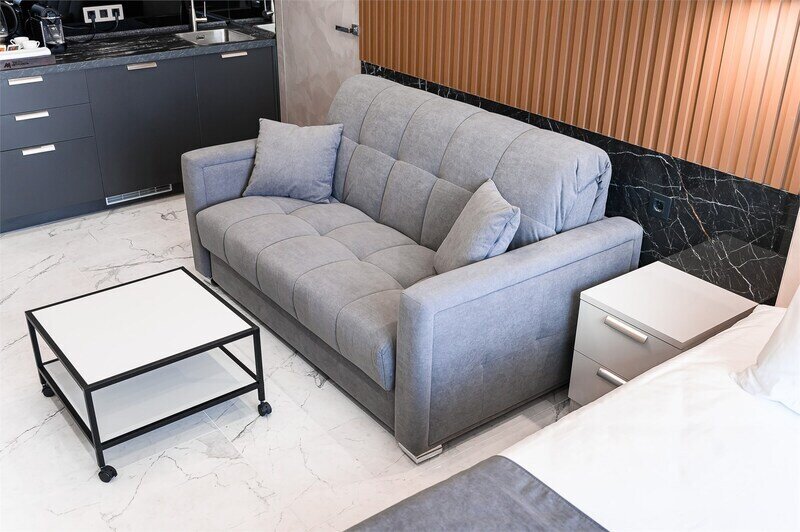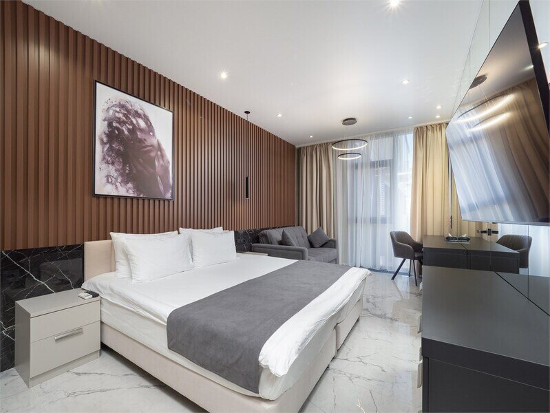 Уютный однокомнатный номер повышенной комфортности с одной большой двуспальной или двумя односпальными кроватями с ортопедическими основаниями Botticelli, раскладным диваном и с кухонной зоной.