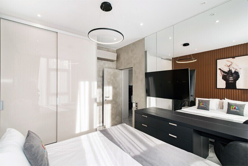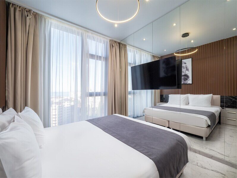Апартаменты Люкс (2 спальни) 6-местный 3-комнатный. Этажи 14,15,16. гостиная объедененная с кухней, обрудованной обеденной зоной и 2мя спальнями